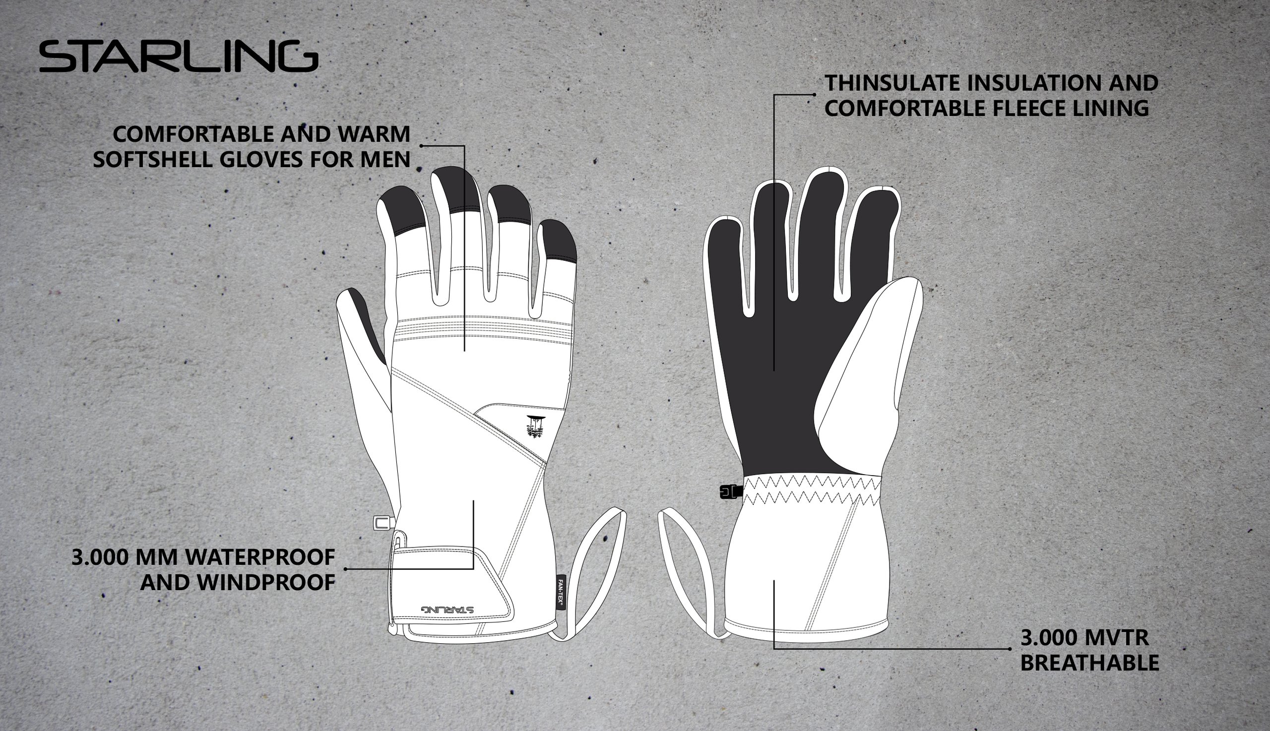 | Produktinformationen | • komfortable und warme Softshell-Handschuhe • FAN-TEX®-Membran (3.000 mm wasserdicht & 3.000 mm Atmungsaktivität) • Thinsulate®-Wärmeisolierung • rutschfeste PU-Handfläche und Fingerspitzen • Klettverschluss an der Oberseite des Handgelenks • Elastikband an der Innenseite des Handgelenks • elastische Handgelenkbänder |