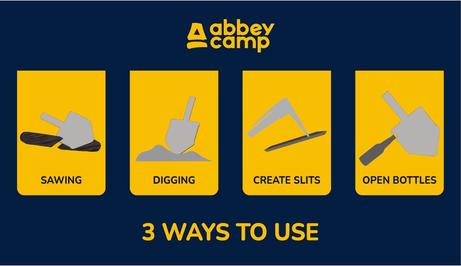 | Produktinformationen | • TPR Handgriff • zweimalig faltbar • geeignet zum Schaufeln, mit Wellenschliff zum Sägen und um Rillen zu machen • mit Spitzhacke und Flaschenöffner • gefaltet im Futteral • Futteral kann am Gürtel getragen werden |