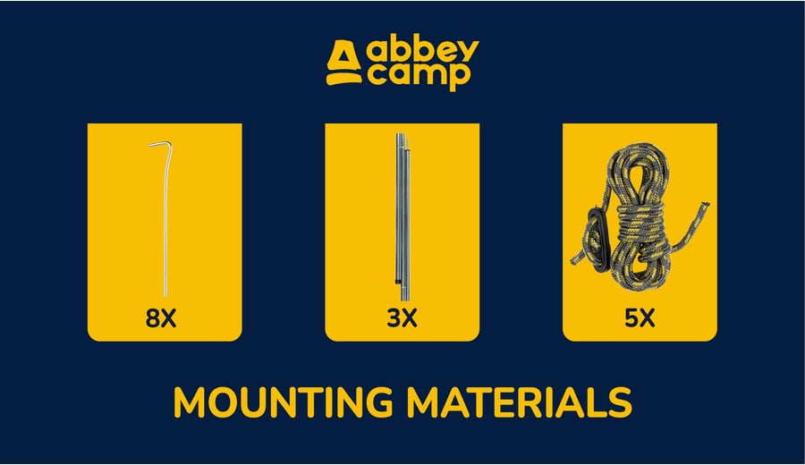| Inhalt Verpackung | Tuch, 3 Gestänge, 8 Heringe, 5 Zeltleinen |