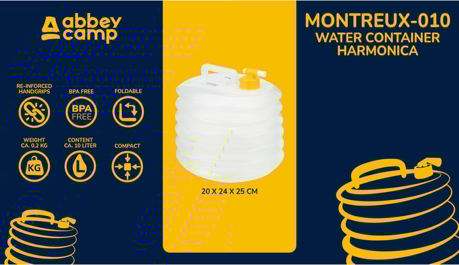 | Produktinformationen | • Schraubverschluss versehen mit praktischem Zapfhahn • Harmonikamodell • falls leer Kompakt mit zu nehmen • extra verstärkter, integrierter Handgriff • Inhalt ca. 10 Liter • geeignet für Trinkwasser; BPA frei |