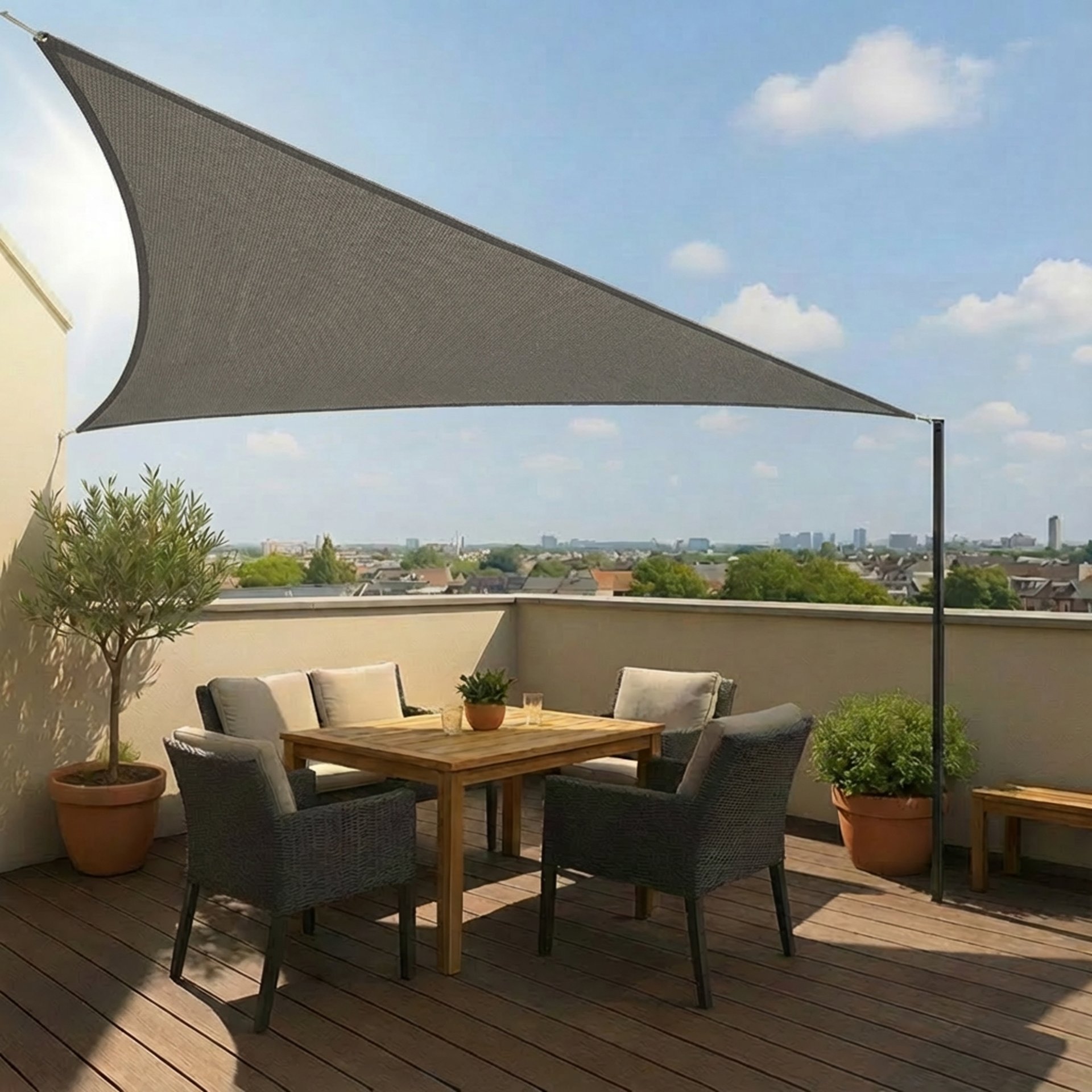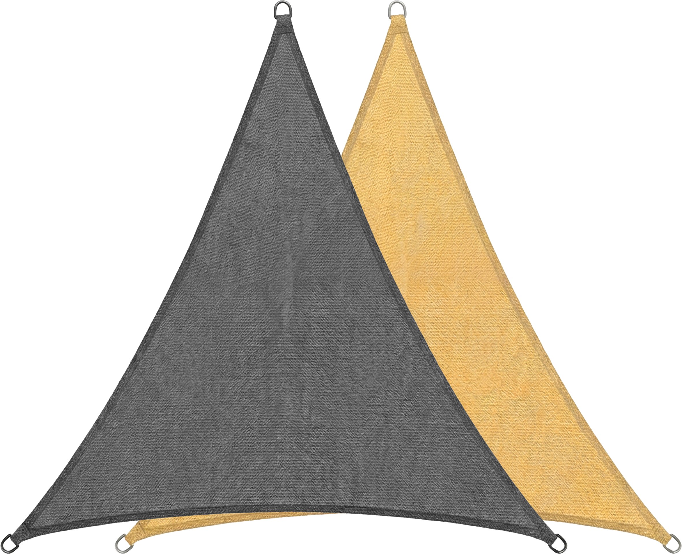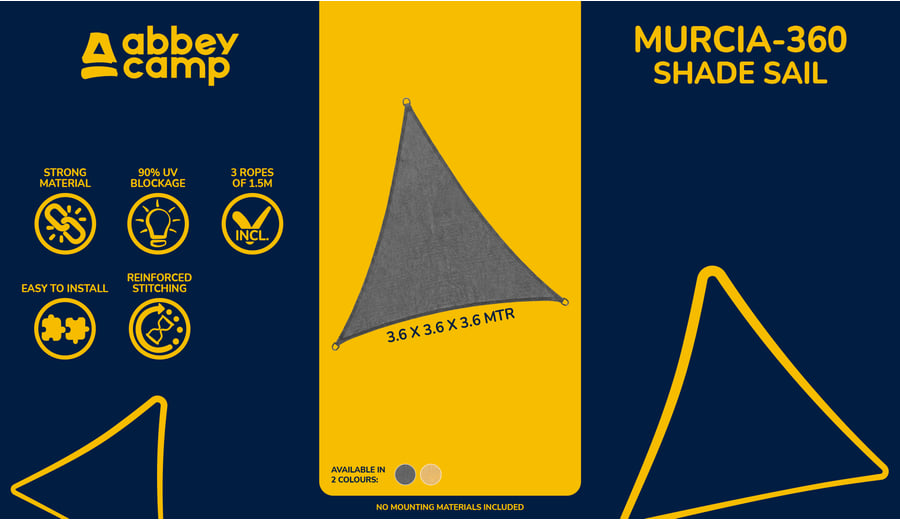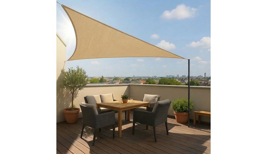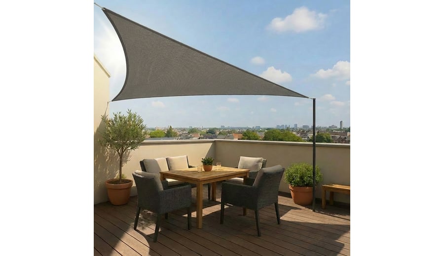 | Produktinformationen | • dreieckige Tarp 3,6 × 3,6 × 3,6 m • unbehandeltes, hochwertiges HDPE-Material • 90 % Sonnenschutz • starke, rostfreie Edelstahl-D-Ringe an jeder Ecke • extra starke, stark verstärkte Nähte an den Ecken und entlang der Ränder • einfach zu installieren • inklusive 3 × 1,5 m Abspannseil • kein Befestigungsmaterial im Lieferumfang enthalten |