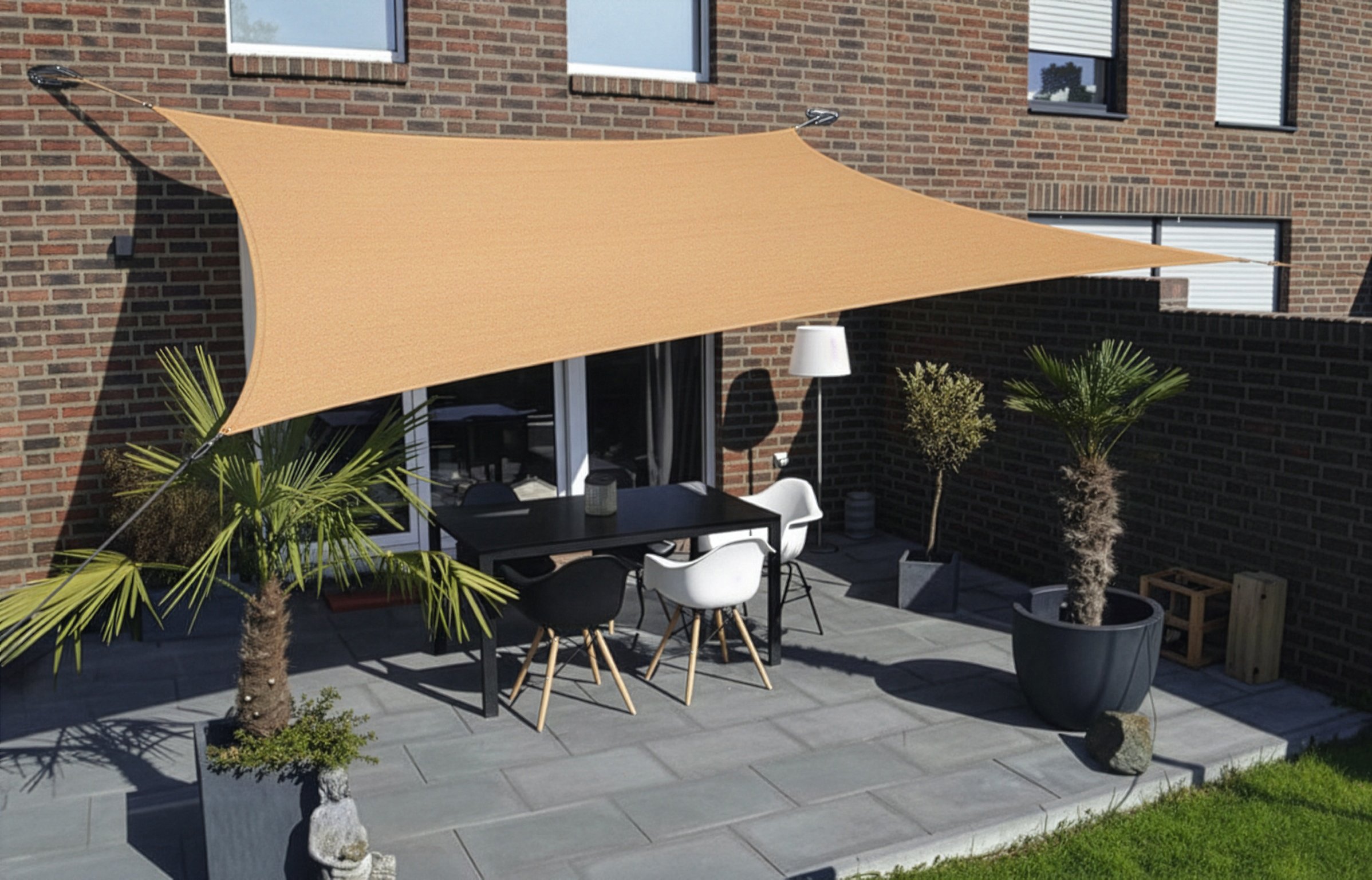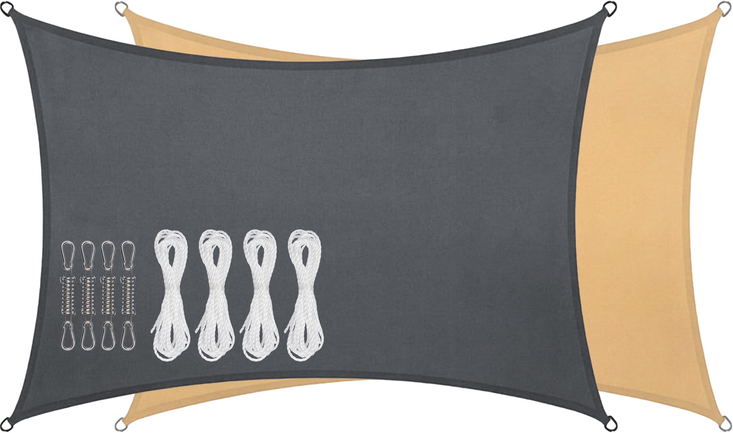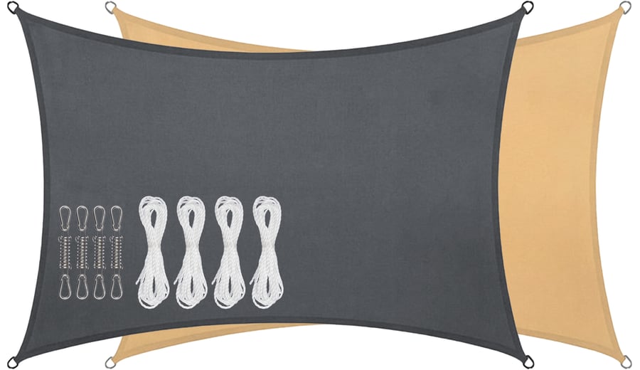 | Produktinformationen | • rechteckige Tarp 3 x 4 m • Polyester (160 g/m²) mit verstärkende PU-Beschichtung • UPF 50+ für optimalen Sonnenschutz • starke, rostfreie Edelstahl-D-Ringe an jeder Ecke • besonders starke, schwer verstärkte Nähte an den Ecken und entlang der Ränder • einfach zu installieren • inklusive 4 × 1,5 m Befestigungsschnur • inklusive 8 Karabinerhaken und 4 Federverschluss |