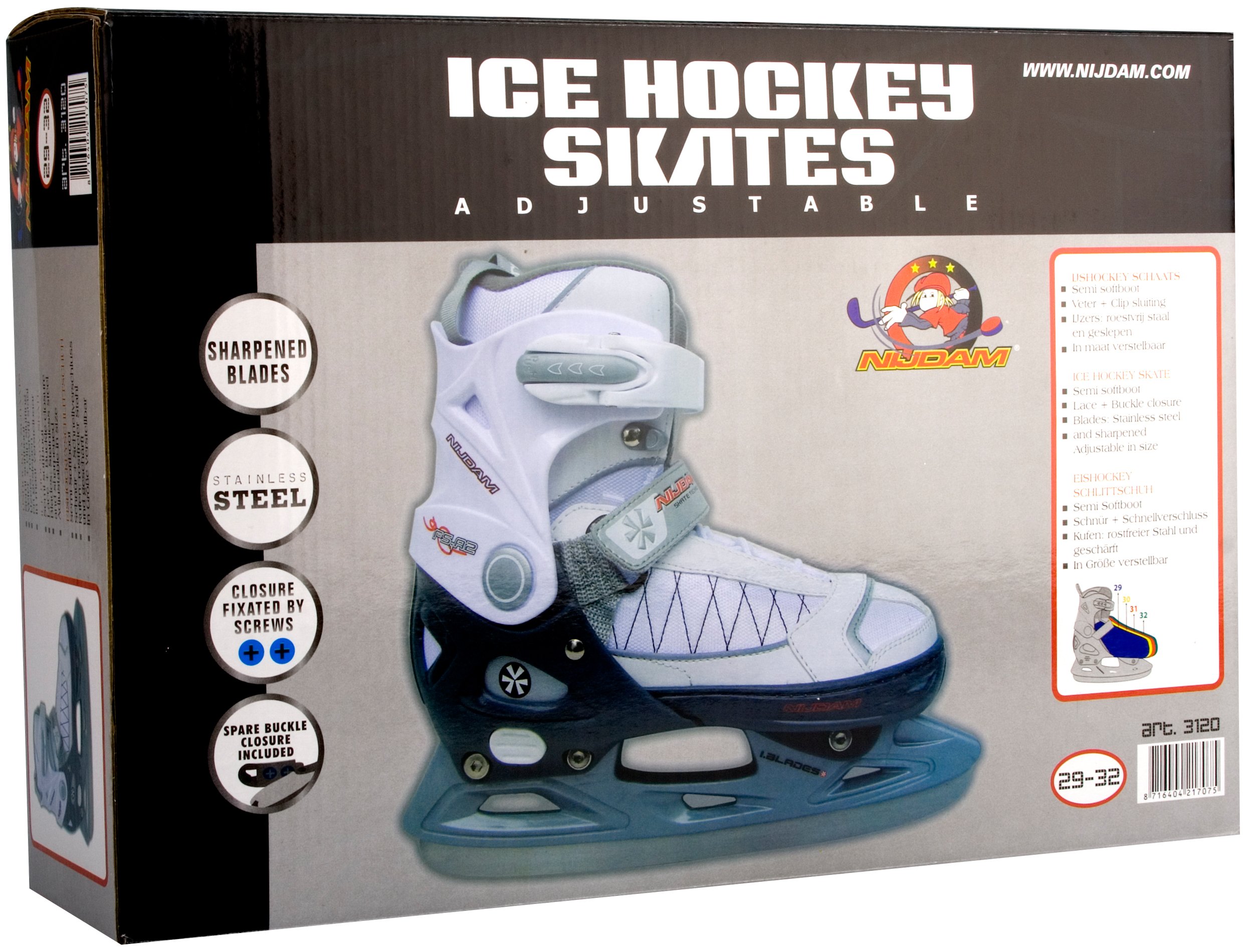 | Produktinformationen | • Polyester Mesh/PU lederner Semi-Softboot • verstellbar in 4 Größen mittels Druckknopfs an der Ferse • zweiseitiger Schnellverschluss mit Schloss befestigt mittels ein einfach zu ersetzen verschraubter Verbindung • Größe 29/32 mit 2x Klettbandverschluss, Größe 33/36 und 37/40 mit Schnürverschluss und Ristband mit Klettband • TPE Knöchel-, Ferse- und Zehenkappe • synthetischer Kufenhalter mit Eishockeykufen aus rostfreiem Stahl • Kufen ohne Kunstlaufspitze • Schlittschuhkufen sind schon vorgeschärft worden |