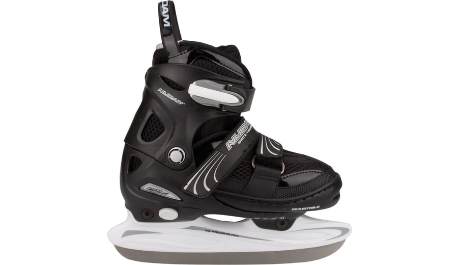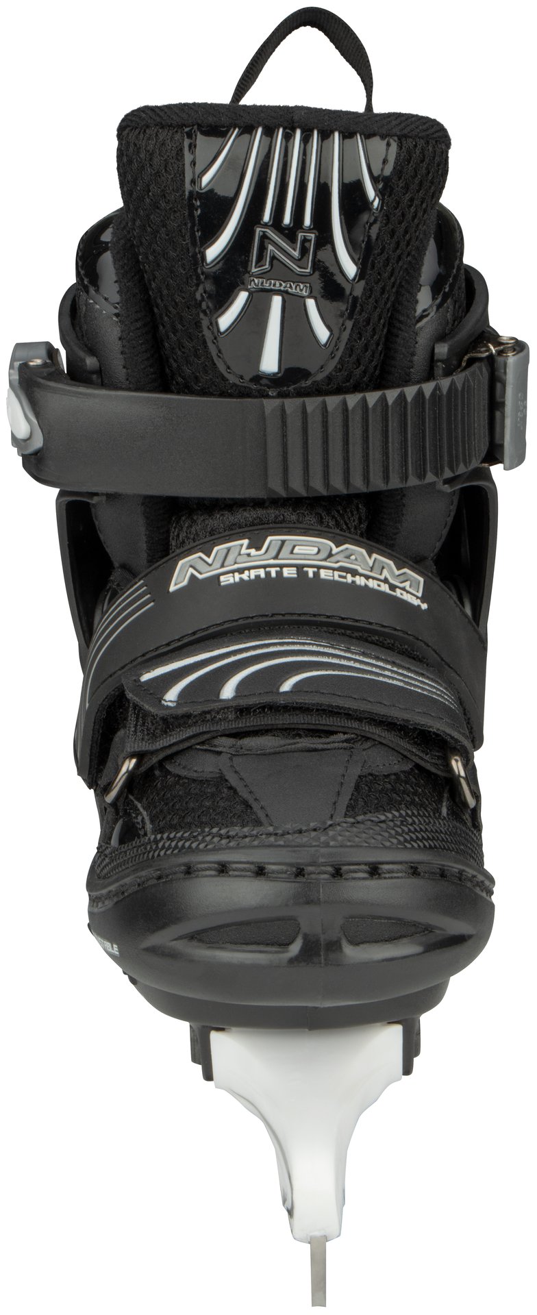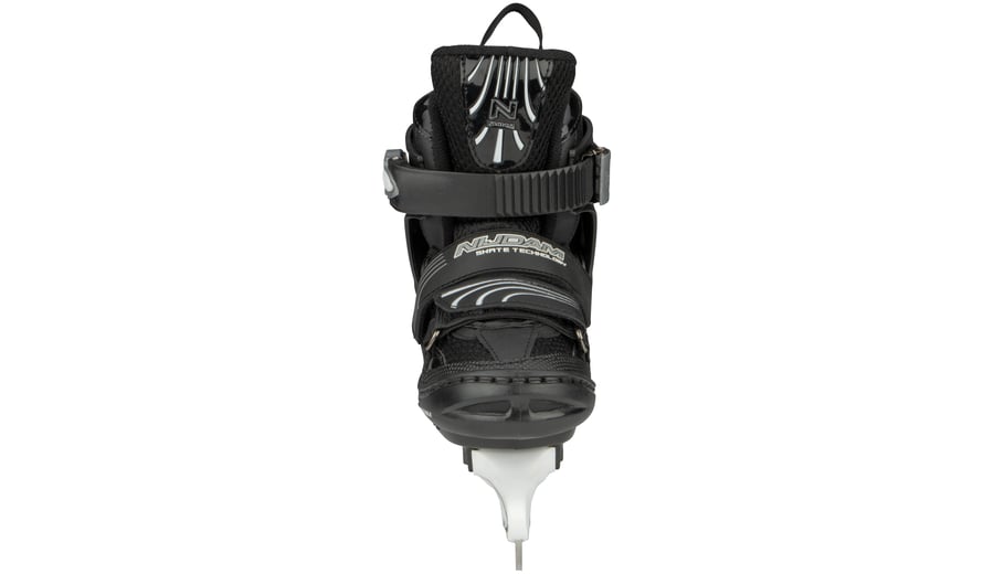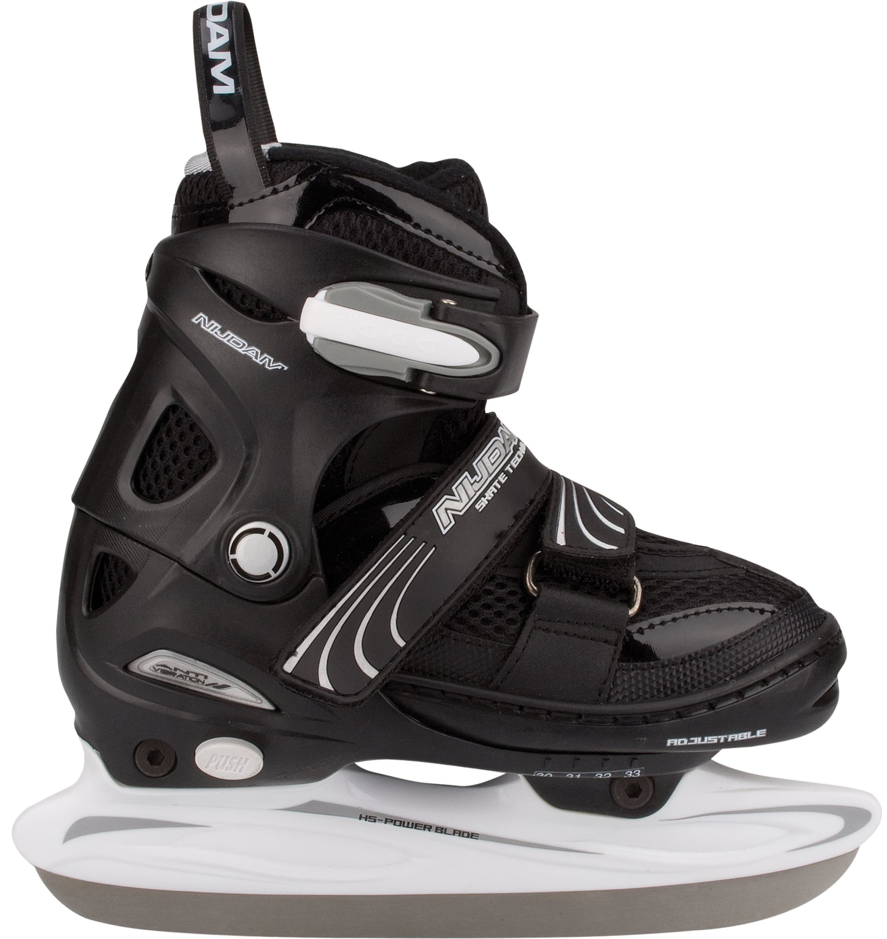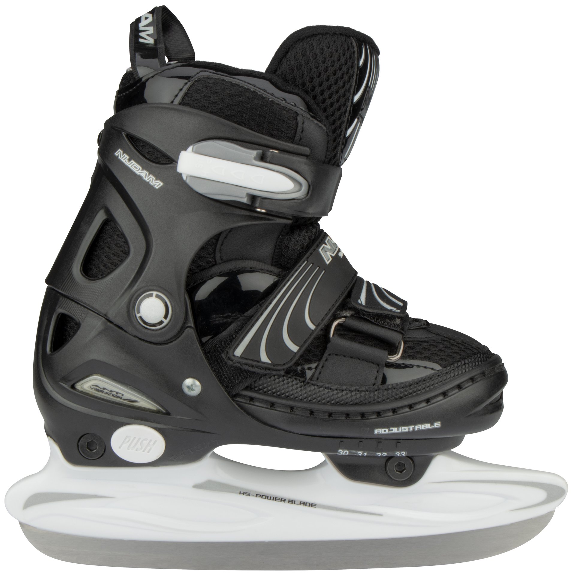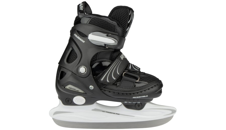 | Produktinformationen | • Polyester Mesh/Kunstlederner Semi-Softboot • verstellbar in 4 Größen mittels Druckknopfs an der Ferse • zweiseitiger Schnellverschluss mit Schloss • Größe 30/33 mit 2x Klettbandverschluss, Größe 34/37 und 38/41 mit Schnürverschluss und Ristband mit Klettband • TPE Knöchel-, Ferse- und Zehenkappe • synthetischer Kufenhalter mit Eishockeykufen aus rostfreiem Stahl • Schlittschuhkufen sind schon vorgeschärft worden |