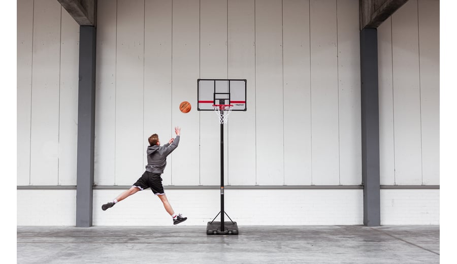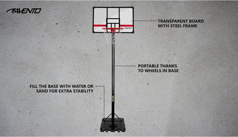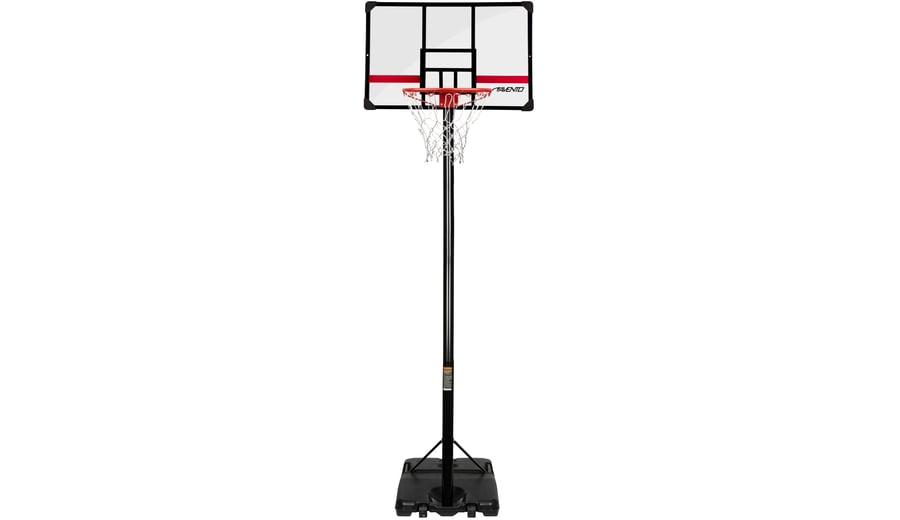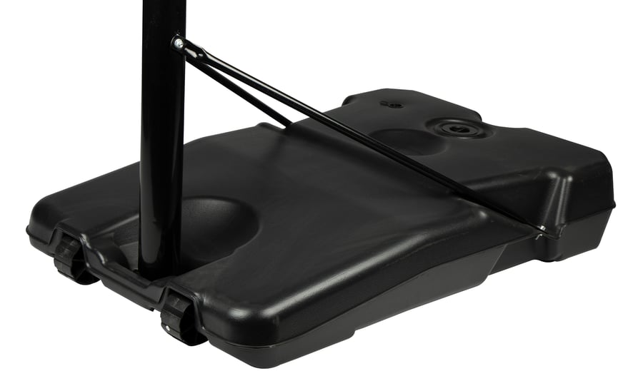 | Produktinformationen | • mobile metal basketball stand • metal rod is, diameter approx. 8 cm, adjustable in height from approx. 225 cm up to approx. 305 cm • 16 mm metal ring with epoxy coating, diameter approx. 45 cm • weatherproof nylon net • PE base can be filled with sand or water for stability, dimensions approx. 108 x 74 x 17 cm • easy mobility thanks to sturdy built-in wheels • square transparent board with steel frame, dimensions approx. 107 x 72 x 3 cm • for indoor and outdoor use |