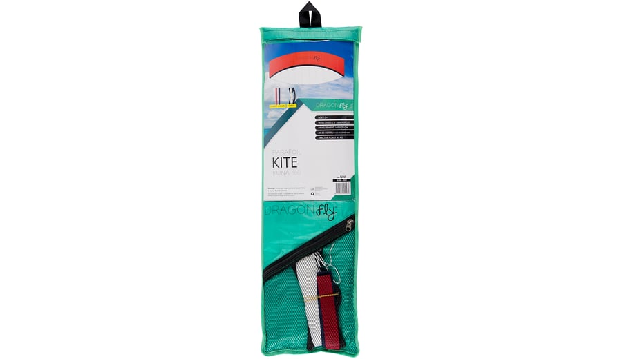 | Produktinformationen | • Fallschirmdrachen • reißfestes Polyamidesegeltuch, ohne Gestell • 2 Polyester Lenkschlaufen • Kunststoff Winder mit 2x 30 Meter geflochtener Polyester Drachenleine • 45 Kg Zugkraft • zu benutzen bei Windstärke 1.5 bis 6 Bft • Abmessung 160 x 65 cm |