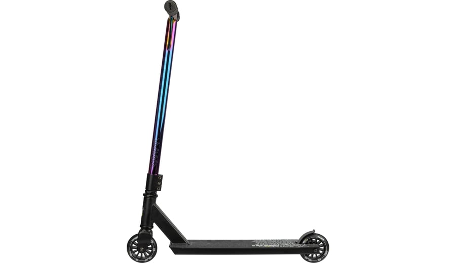 | Produktinformationen | • aluminium/ heavy-duty steel frame with neochrome finish • strong rectangular frame construction • aluminium deck with griptape • rubber handgrips with impact protection • ABEC 7 bearings • 85A PU spoked wheels, PP core, dimensions 100 x 24 mm • non-foldable/detachable handlebar • triple fixation collar • steel rear footbrake • width handlebar 44.5 cm • hight handlebar 83 cm, not adjustable • dimensions deck 48 x 10.6 cm • weight approx. 3.7 kg • maximum load 100 kg |