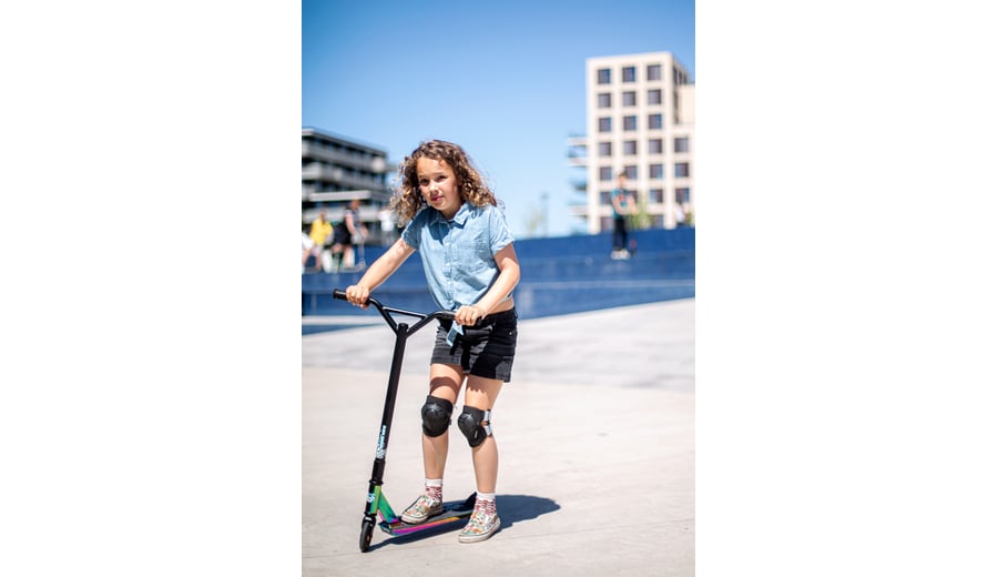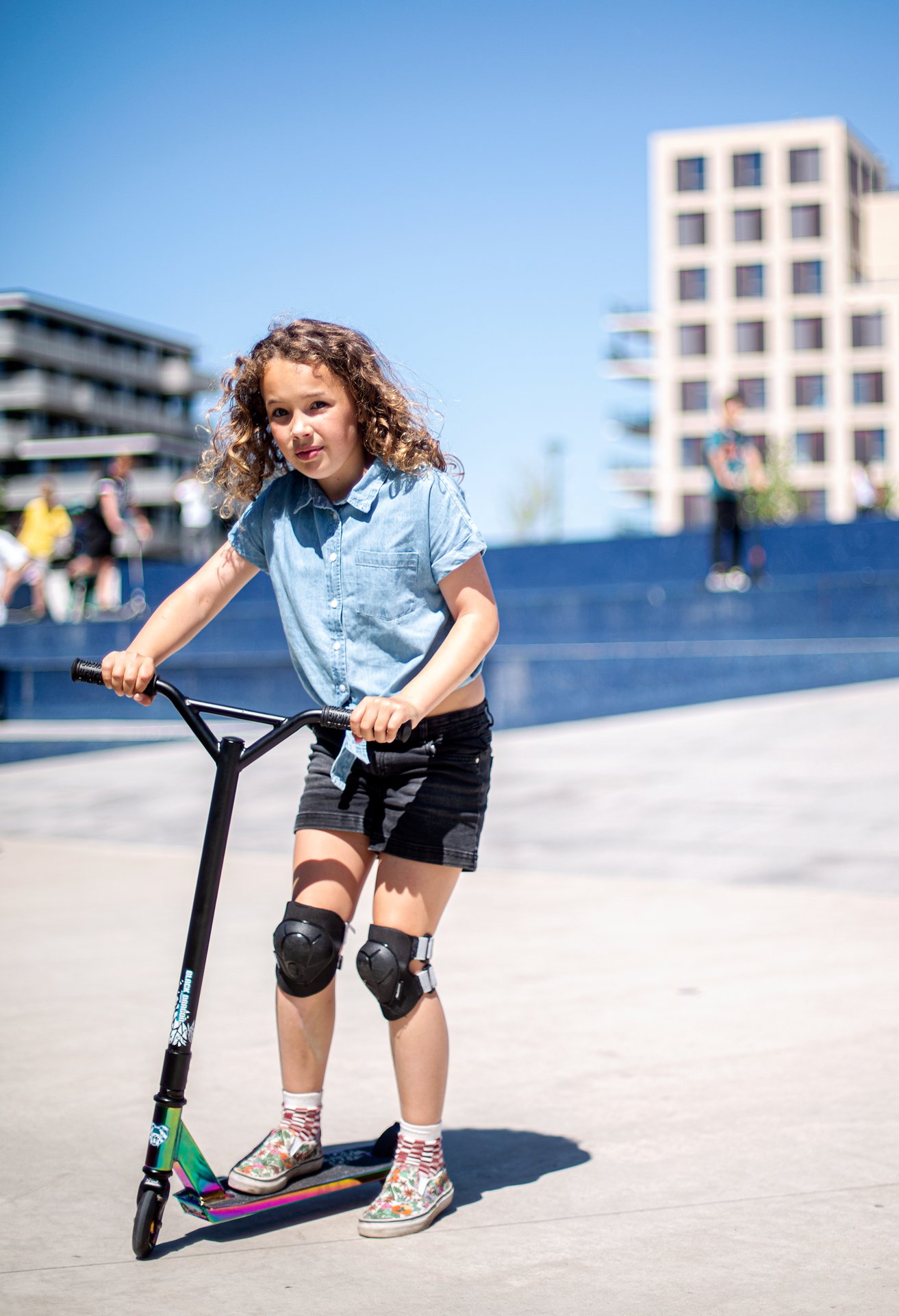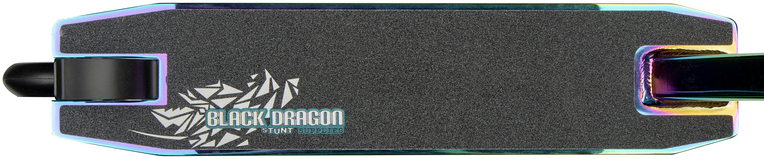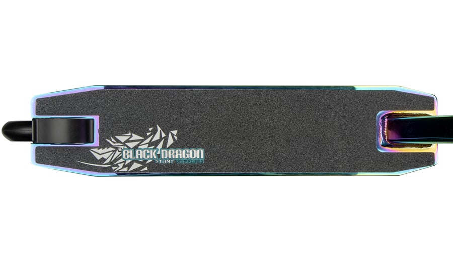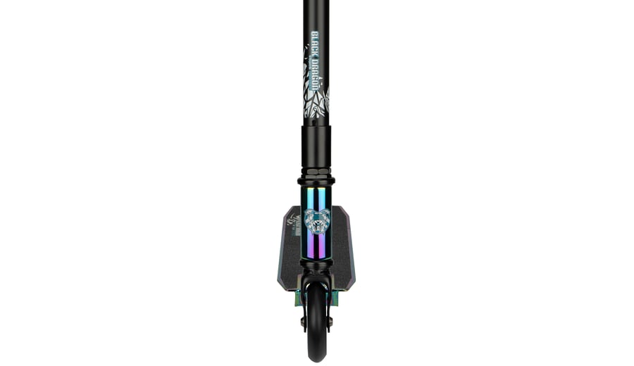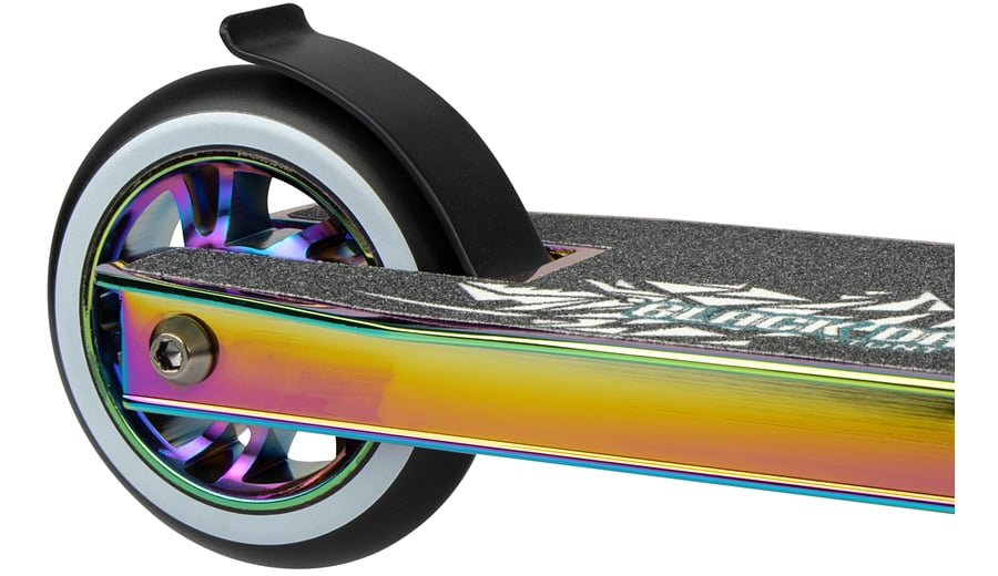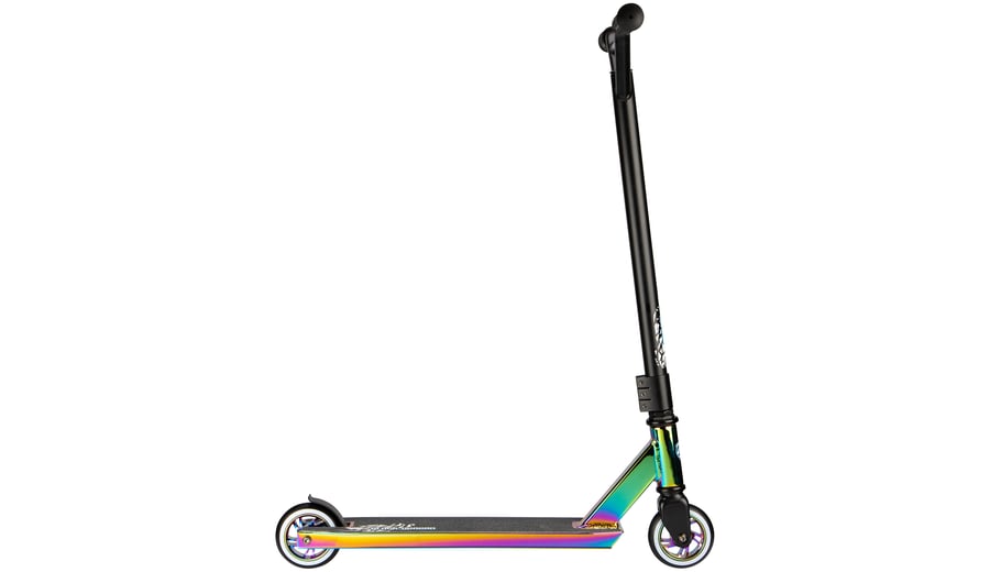 | Produktinformationen | • aluminum frame, matt black and neochrome finish • strong rectangular frame construction - made for doing tricks • neochrome aluminum deck with griptape and print, 48 x 10.6 cm • steel T-bar handlebar, non-foldable/detachable, 83 x 44.5 cm • matt black triple fixation collar • rubber handgrips with impact protection • ABEC 9 closed bearings carbon • 85A PU cast wheels with neochrome aluminum spoked core, 100 x 24 mm • steel flex brake on the rear wheel • weight approx. 4 kg • maximum load 100 kg • including 2 allen keys and manual |