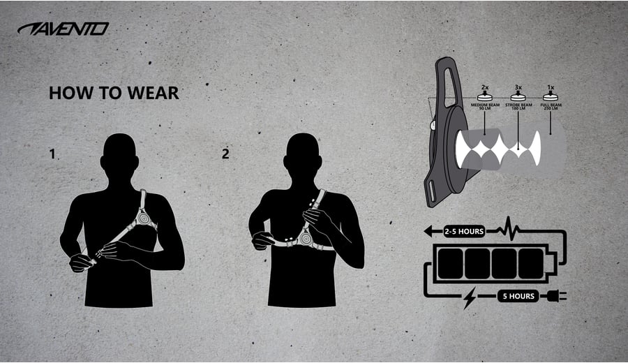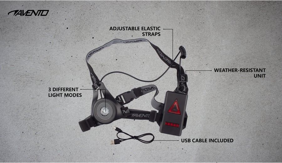 | Produktinformationen | • verstellbare elastische Gurte • ABS-Gehäuse vorne und hinten • 1 starke weiße und 8 rote LED-Leuchten • wiederaufladbarer Akku im rückseitigen Gehäuse • USB-C-Anschluss • Leuchten können dauerhaft leuchten (2 Modi) oder blinken • entspricht den folgenden Normen: EN 62471:2008 / EN 61547:2009 / EN IEC 55015:2019 + A1:2015 / EN 13356:2001 |