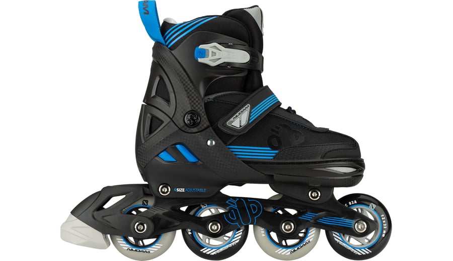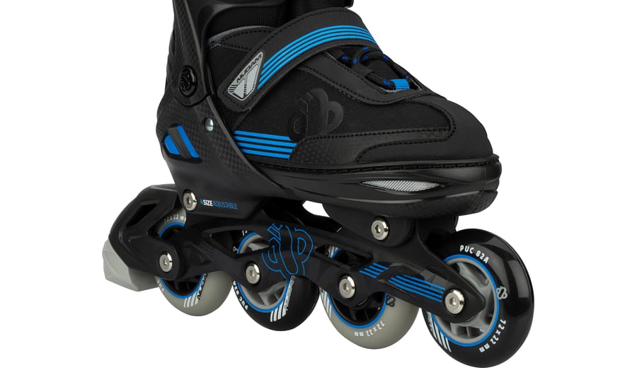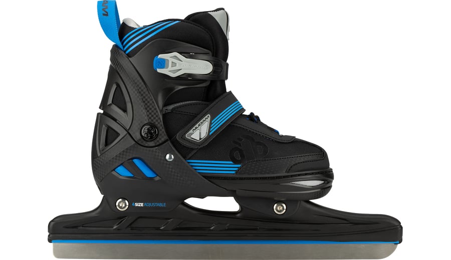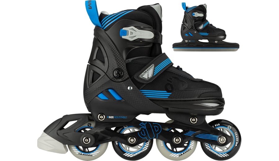 | Produktinformationen | • 2 configurations possible: Inline skates or ice skates • Size-adjustable to 4 sizes by means of push button on the heel • Design: Semi-softboot made of shockabsorbing TPE and PU leather/polyester mesh • Fasteners: Quick-lock fastening with PU leather powerstrap and laces • Inner shoe: Comfortable polyester shoe, with a lining of EVA and pearl foam • Chassis: High-impact PP blade holder and aluminium skate chassis • Blades (ice skate): Carbon steel speed hockey blades • Blades have been pre-sharpened • Wheels (inlines): PU casted 82A, size 29-32: 64 x 22 mm, sizes 33-36 and 37-40: 72 x 22 mm • Bearings (inlines): Sealed ABEC 5 half-chrome • Brake (inlines): TPR 82A • Tools: 2 Allen keys included |