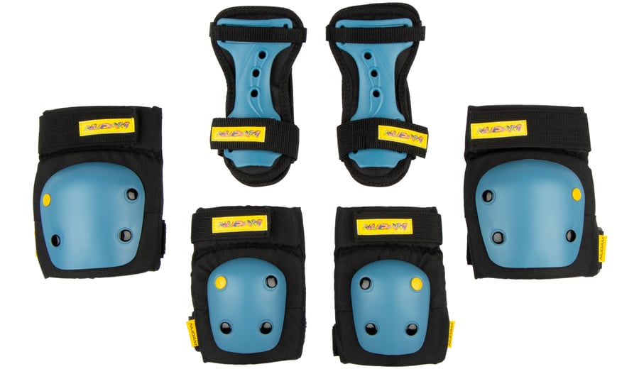 | Produktinformationen | • Main pads: comfortable, sturdy EVA foam with 600D Nylon cover • Protective caps: high-impact shock-absorbing PE with rivets • Each element is adjustable thanks to the elastic straps and Velcro closures • Set includes 1 pair of elbow-, wrist- and knee protectors • Set meets current safety standards |