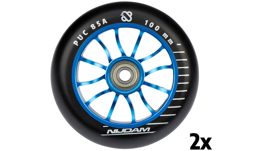 | Produktinformationen | • 85A PU wheels, matt black • Spoked aluminum core, blue finish • ABEC 7 chrome bearings • 100 x 24 mm • Set of 2 wheels with 4 bearings • For stunt scooters |