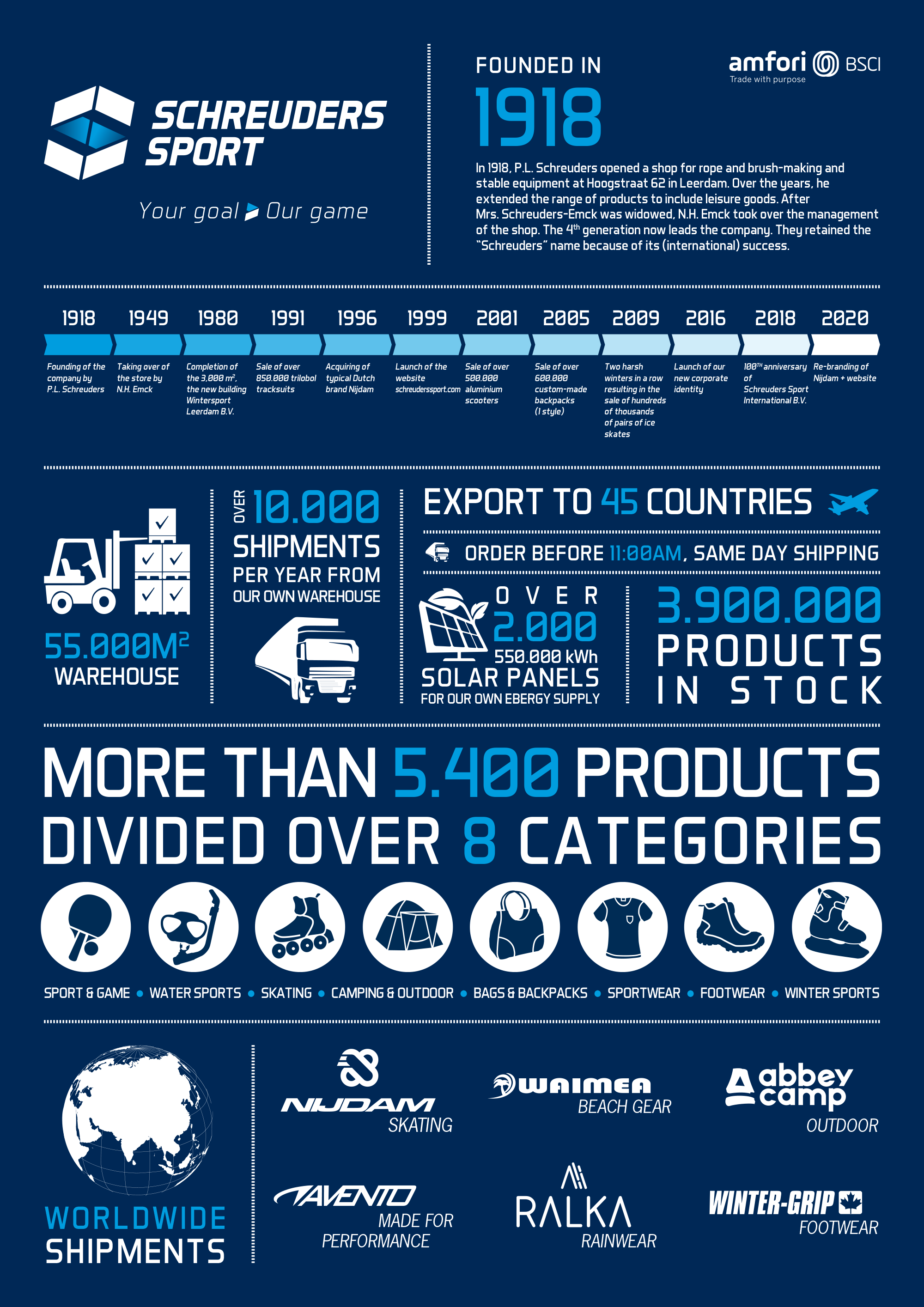 That means more than 13 football pitches worth of affordable summer and winter products for everyone! From skateboards, sportswear and fitness equipment to skates, sleds, gloves and hats - we have everything! This massive selection makes Schreuders Sport the ideal partner for both large and small orders.