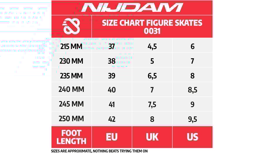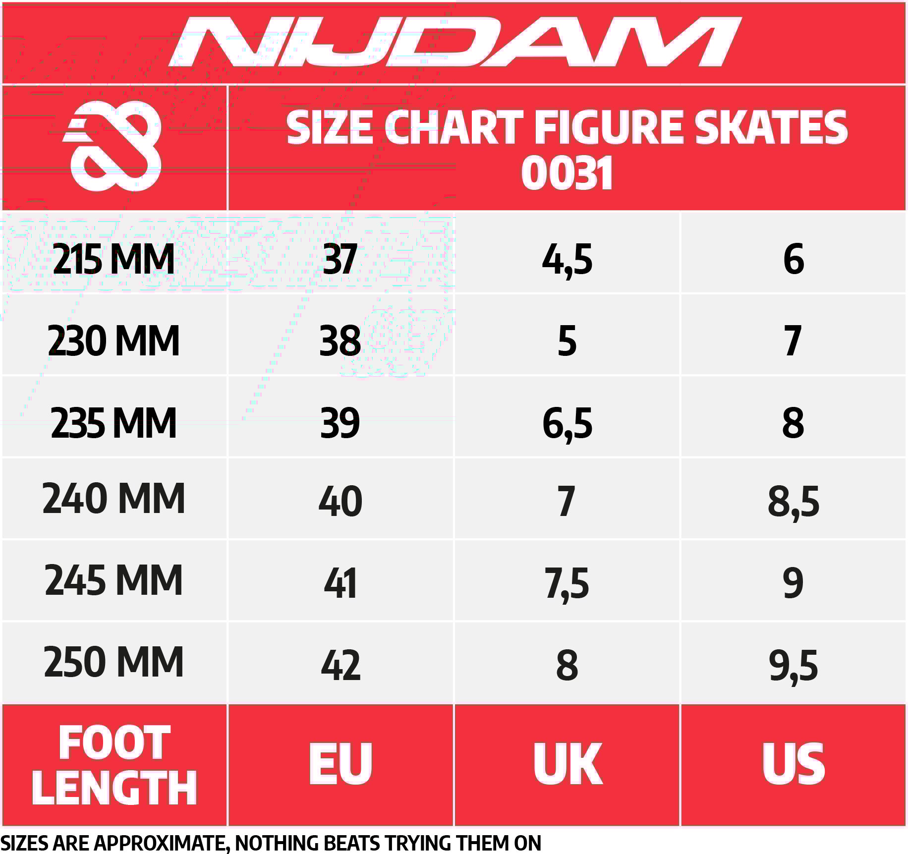 | Characteristics | • Design: 2-section hard boot figure skating shoe made of shock absorbing TPE • Inner shoe: Removable comfortable polyester mesh inner shoe • Fasteners: 3 double quick-lock fasteners • Chassis: Integrated synthetic blade holder • Blades: Stainless steel figure skating blades • With figure skate toe picks • Blades have been pre-sharpened |