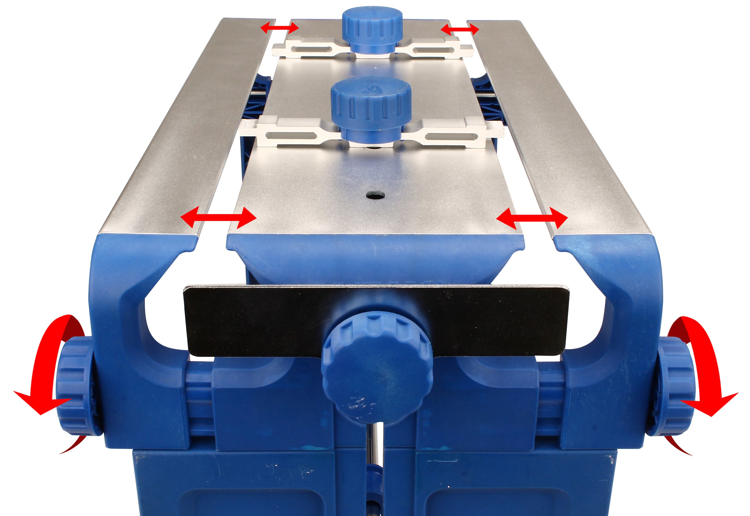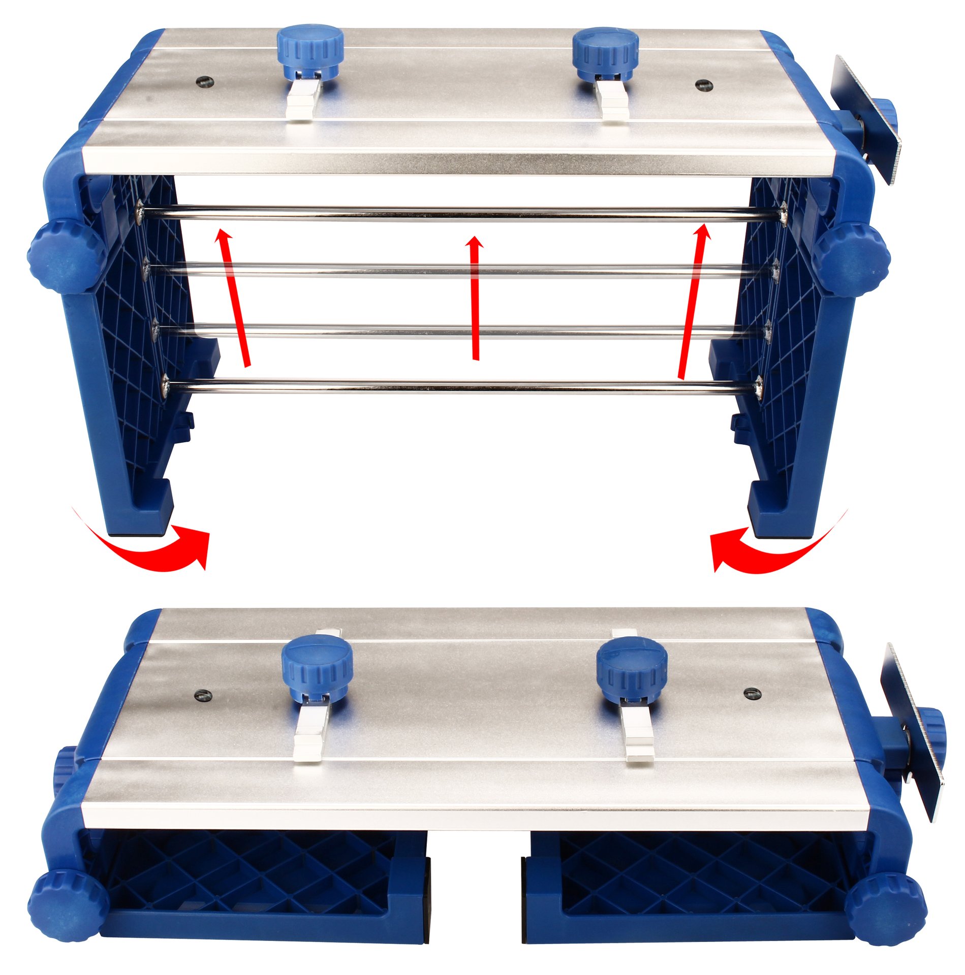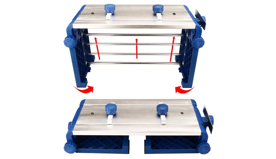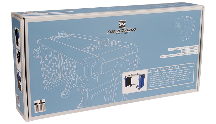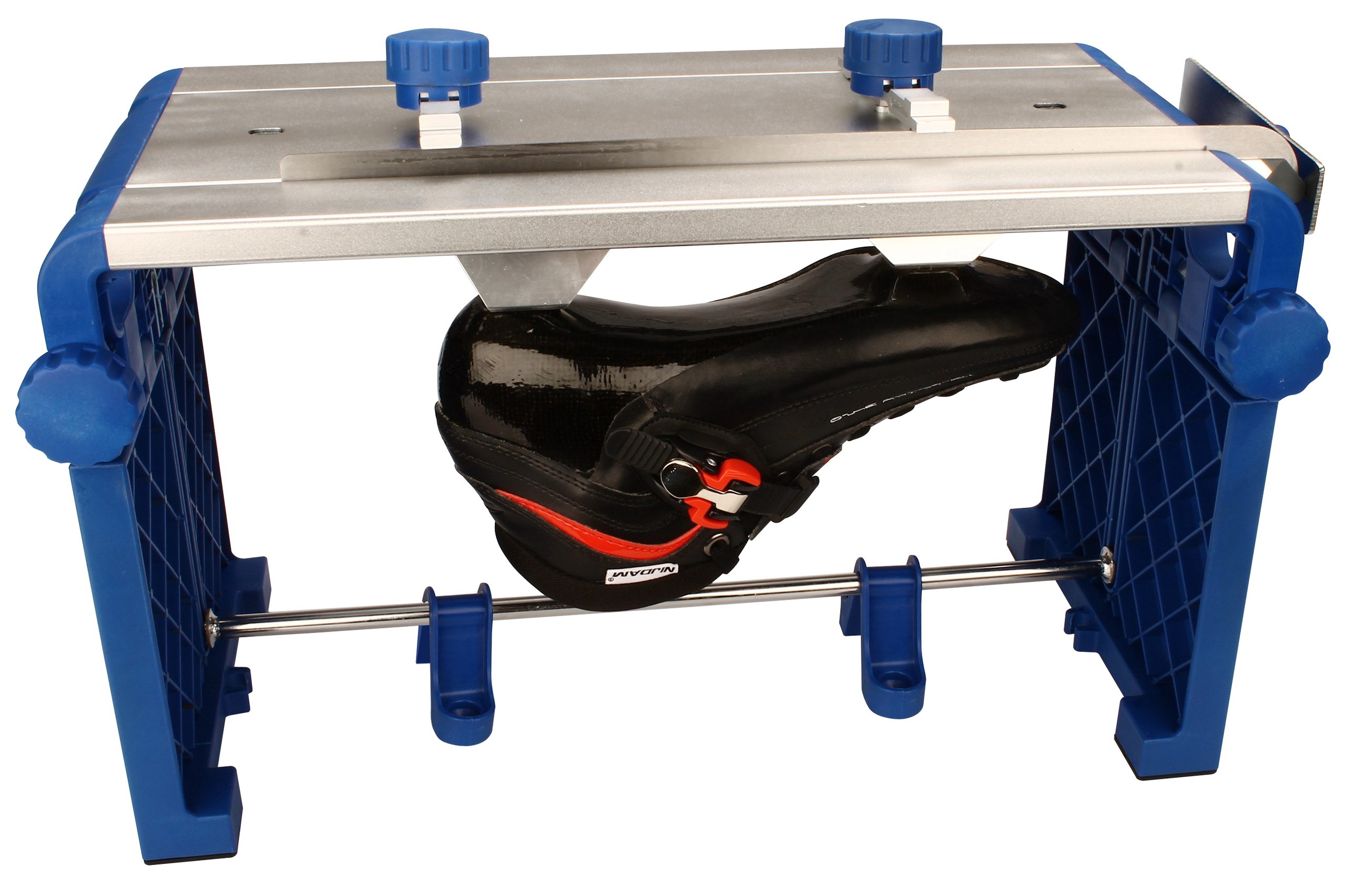 | Characteristics | • 70% nylon/30% fibreglass side parts, knobs and connection tube holders • 7000 aluminum blade desk, skate liners and skate ruler • stainless steel connection tube, springs, bolts and nuts • rubber anti-skid parts • professional and very user friendly sharpening table • foldable • stable • skate liners with 2 heights • skate ruler can be turned away, attachable on workbench by means of tube holders • anti-skid rubbers • suitable for ice skates with synthetic skatetubes up to size 50, also for the most styles of nordic ice skates • dimensions 49.5 x 22 x 29 cm |