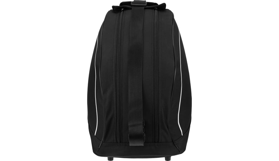 | Characteristics | • water-repellent • double zipper • zippered back pocket • adjustable shoulder strap with quick-lock • handle on top • plastic window with address card • 5 plastic caps on the bottom • dimensions main compartment 26 x 39 x 37/17 cm • dimensions back compartment 5 x 19 x 28 cm |