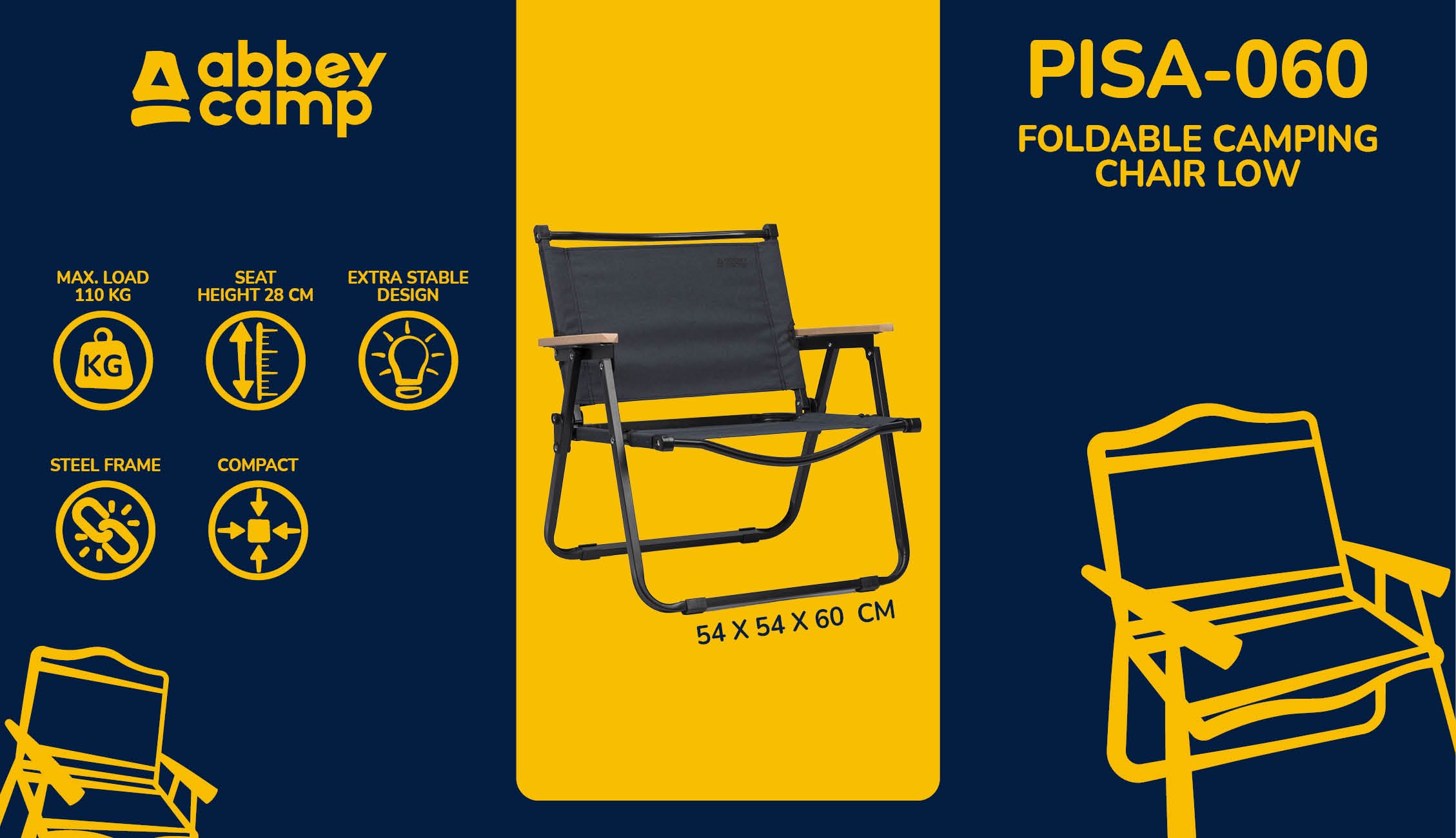 | Characteristics | • steel frame with matt black powder coating • stabilizers for extra stability • 300D Oxford polyester fabric with PU coating and PP piping • beechwood armrests • dimensions approx. 54 x 54 x 60 cm • seat height approx. 28 cm • weight only approx. 2.6 kg • maximum load 110 kg |