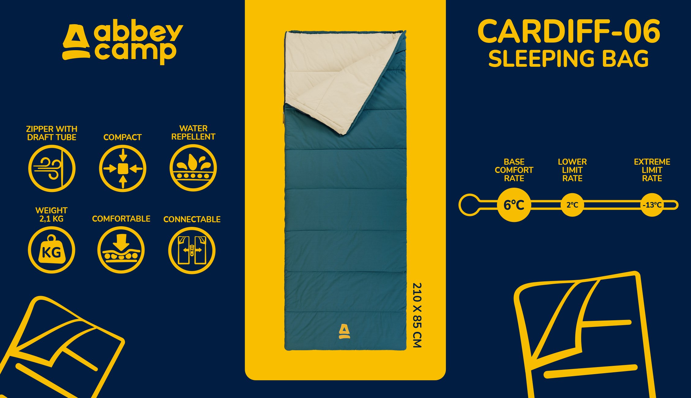 | Characteristics | • sleeping bag made with recycled filling • water-repellent • blanket model, connectable • detachable nylon zipper • draft collar on the inside along the zipper • comfort rate approximately 6 degrees celsius • extreme temperature approximately -13 degrees celsius • dimensions approximately 210 x 85 cm • packed sleeping bag dimensions approximately 42 x 26 x 26 cm • comes with a convenient cotton carry bag |