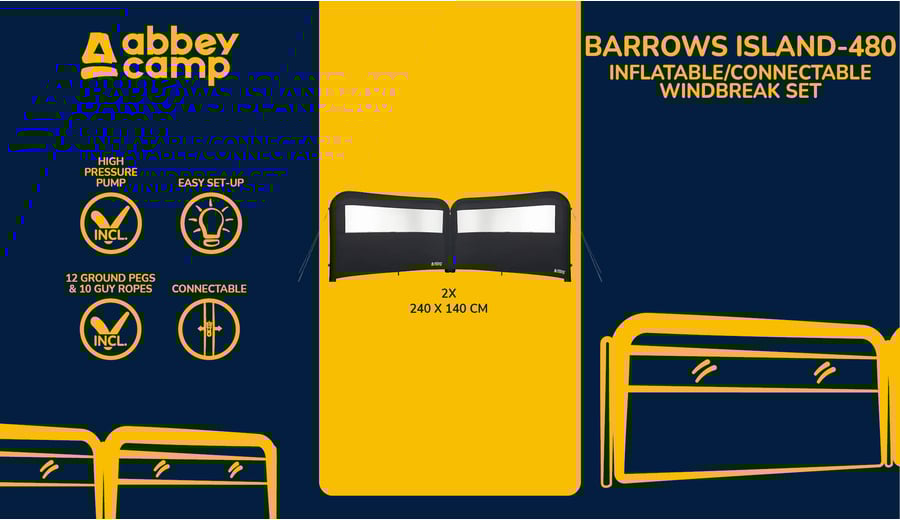 | Characteristics | • durable TPU air tubes with sturdy polyesterfor extra protection • each tube has strong zippers on both sides to connect windscreens together • weather-resistant and sturdy 300D polyester fabric• approx. 30 cm high full-length windows • 12 stainless steel pegs, length 20 cm • 10 sturdy nylon guy ropes • dimensions 2 x approx. 240 x 140 cm • including high pressure double action pump • comes in a handy carrying bag |