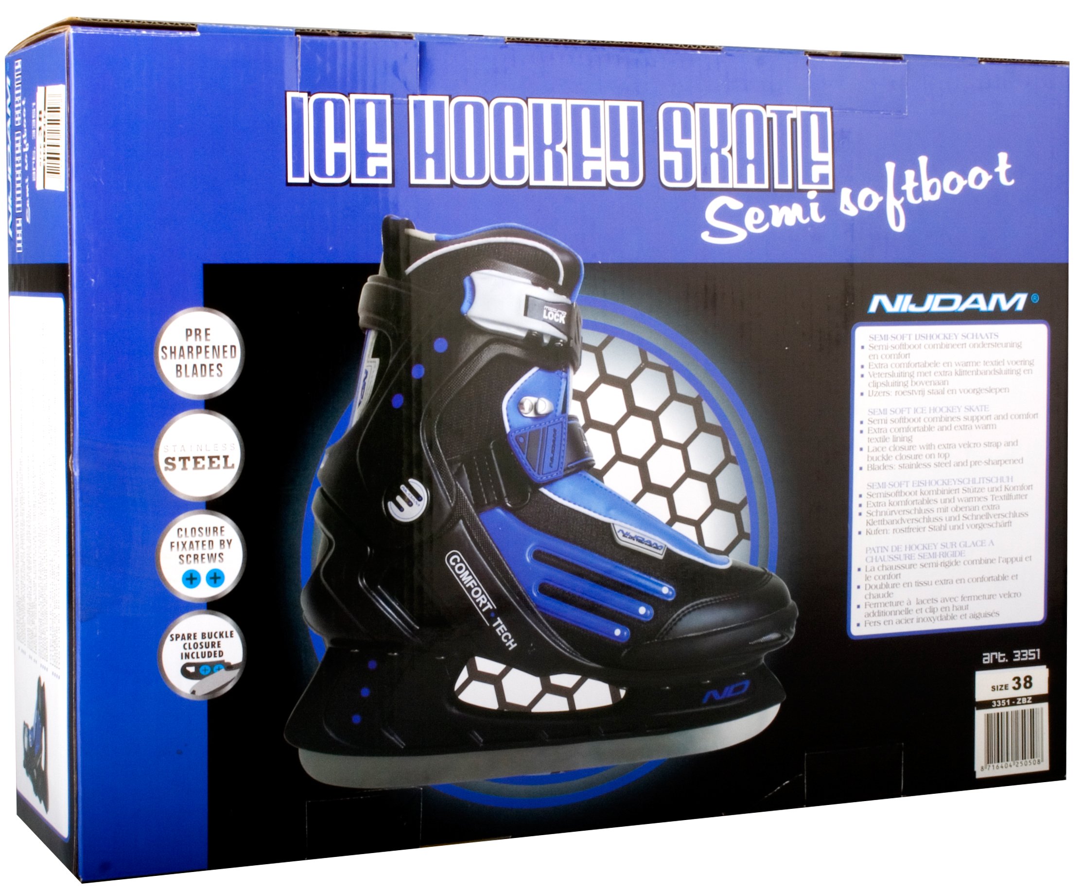 | Characteristics | • Design: Semi-softboot ice hockey shoe made of shock absorbing TPE and artificial leather/polyester mesh • Inner shoe: Comfortable polyester inner shoe • Fasteners: Double quick-lock fastener with PU leather powerstrap and lacing • Chassis: Riveted synthetic blade holder • Blades: Stainless steel ice hockey blades • Blades have been pre-sharpened |