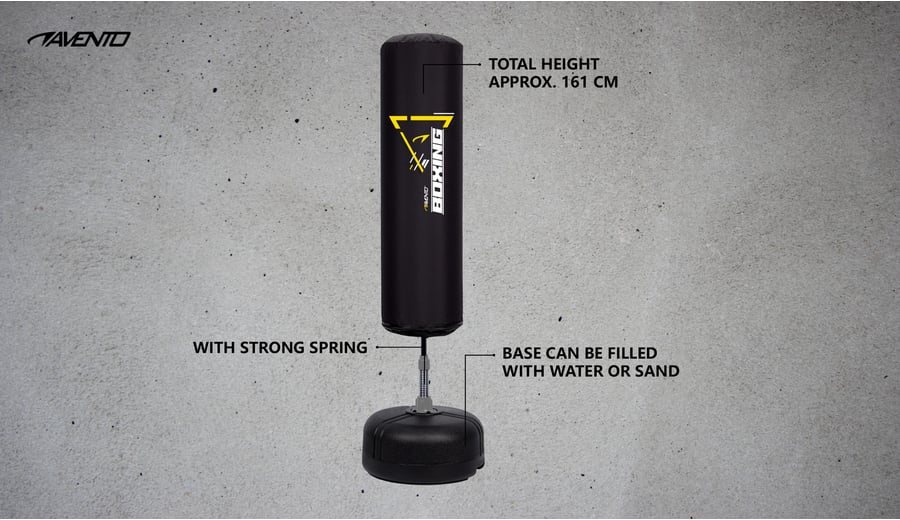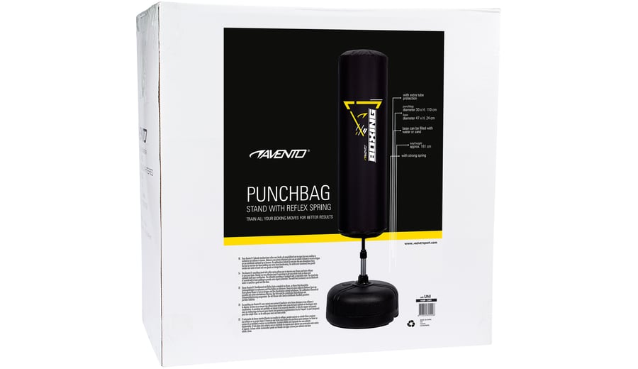 | Characteristics | • removable 300D polyester cover with zipper • inflatable synthetic inner punchbag • chrome-plated steel pole • strong spring between pole and base • high-impact polyethylene base • dimensions punchbag 30 Ø x 110 cm • dimensions base 47 Ø x 24 cm, contents approx. 30 litre • total height approx. 161 cm |