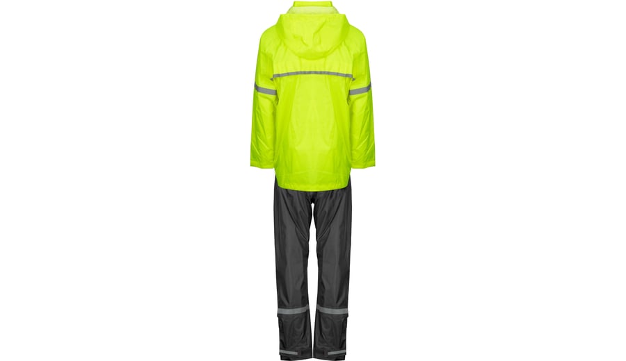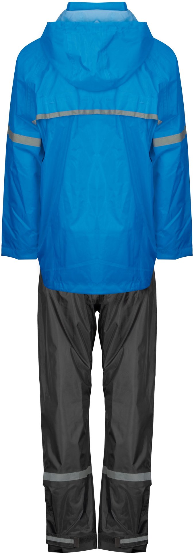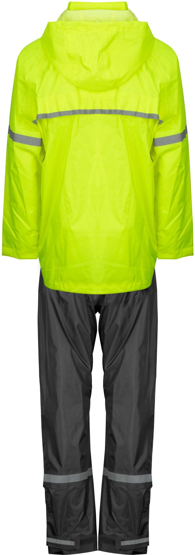 | Characteristics | • PVC coating, 5000 mm waterproof • taped seams • reflective accents • carrying bag Jacket: • raglan sleeve • waterproof zipper with reflective details • hood with elastic cord and stopper in the collar • hem on the bottom with elastic cord and stopper • adjustable cuffs with velcro tape • slit pockets with overfly and velcro fastener • covered ventilation openings on the back Trousers: • elastic waistband • triangular insert at leg ends for easy entry • adjustable leg ends adjustable by means of velcro • shoe protection covers |