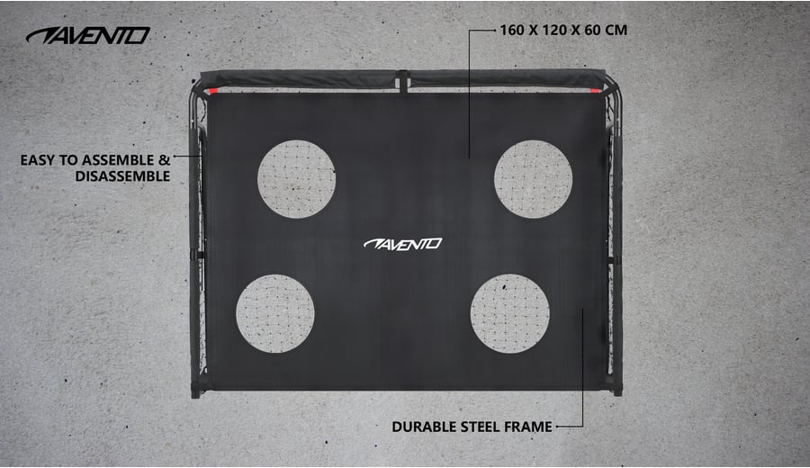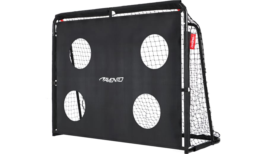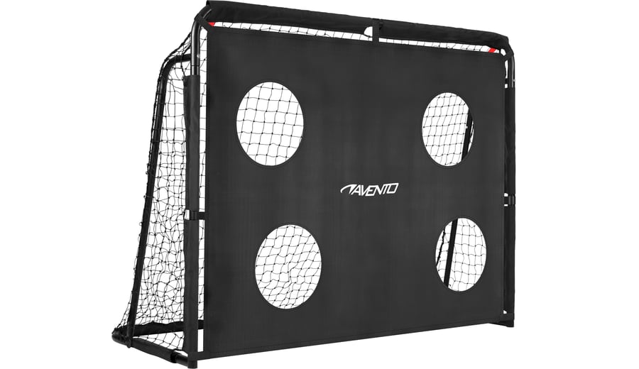 | Characteristics | • sturdy football goal with target screen • easy to assemble • including sturdy anchoring tubes at the posts for extra stability • diameter of the tubes: 32 mm, with matt black powder coating • 1 sturdy goal net • 1 sturdy target screen with 4 holes for extra training possibilities • dimensions 160 x 60 x 120 cm |