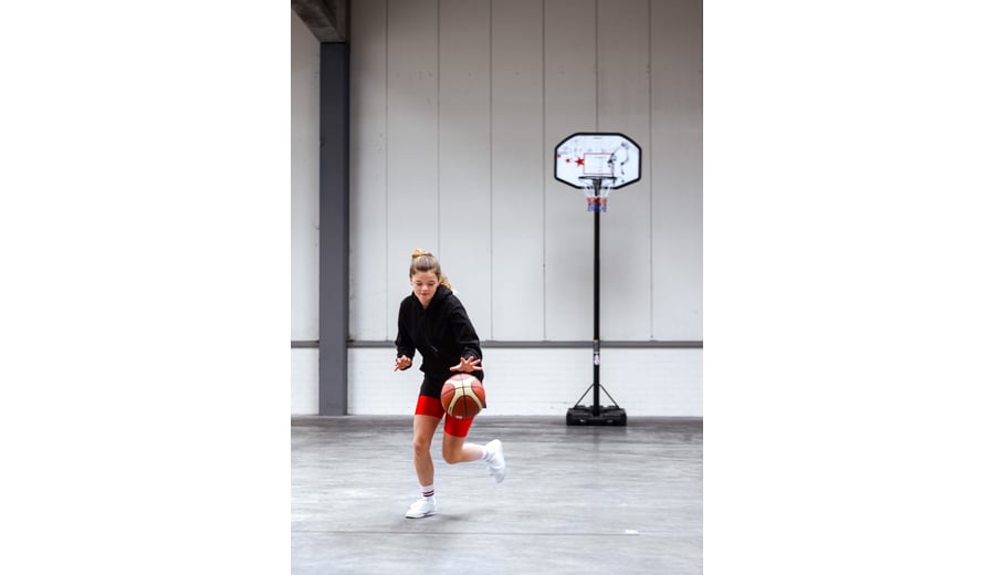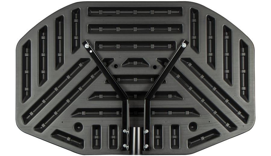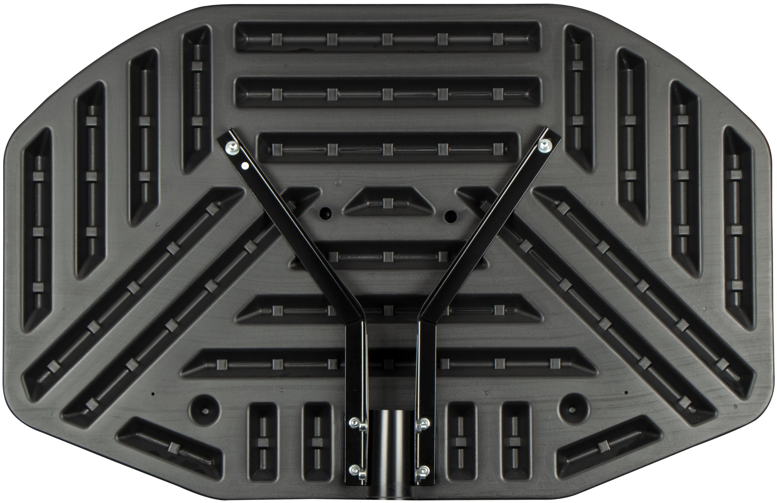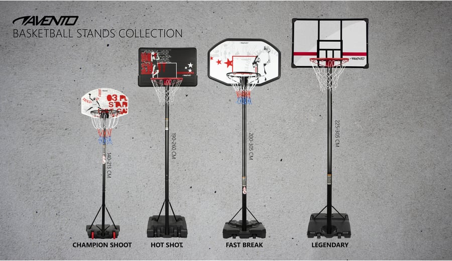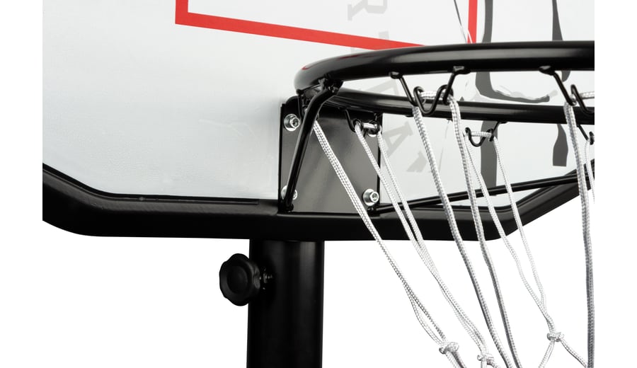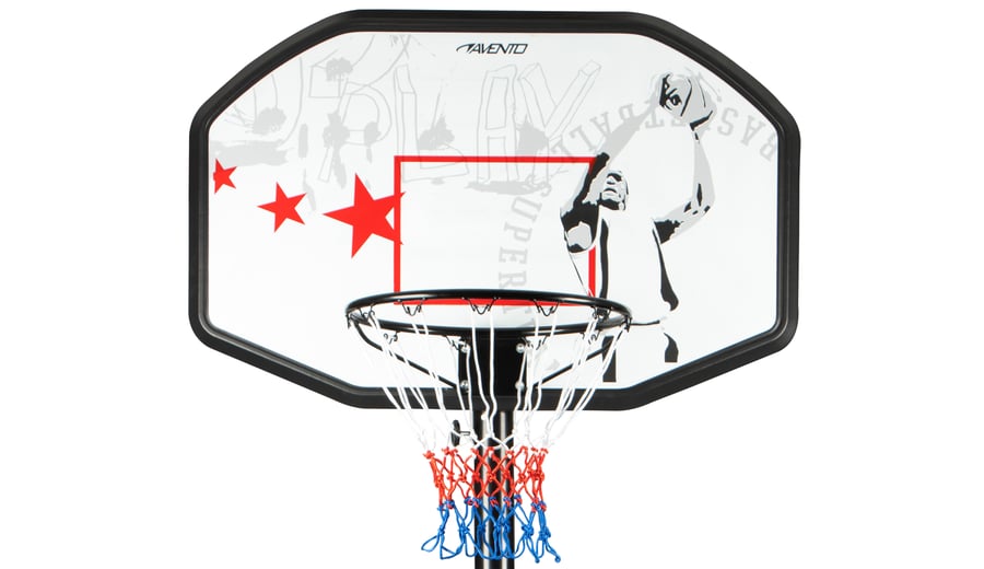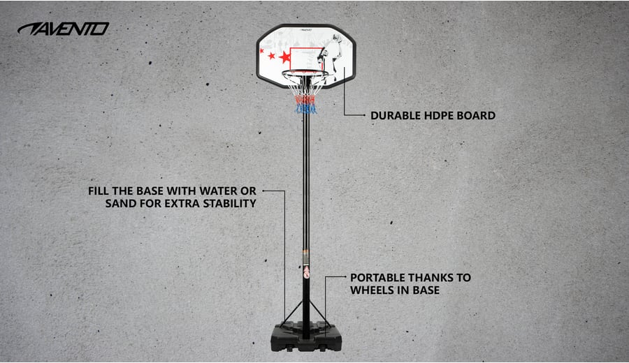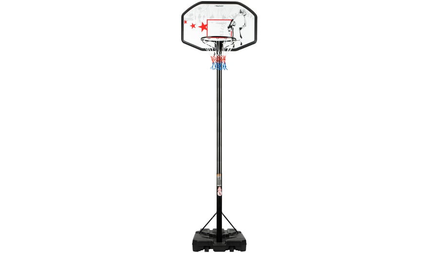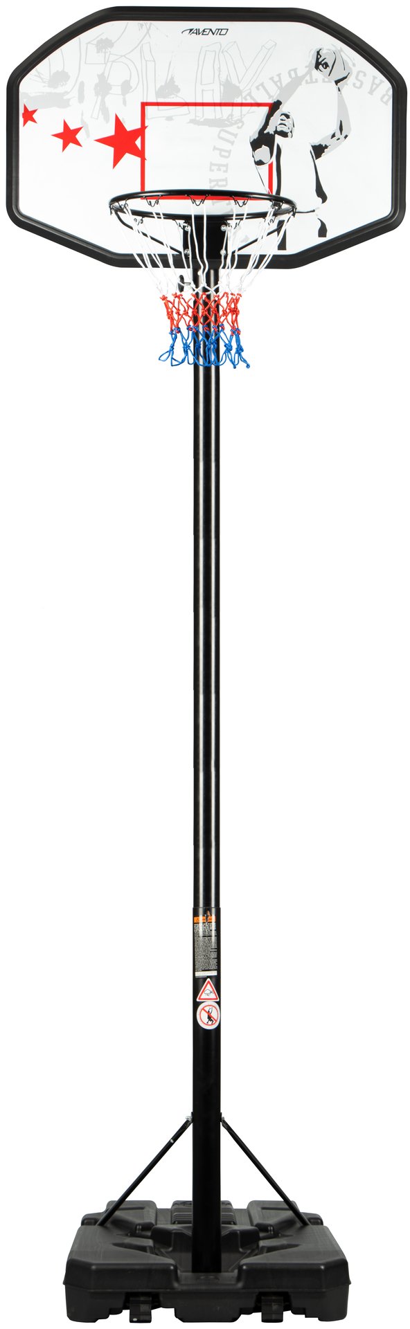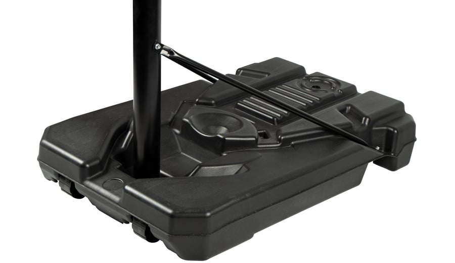 | Characteristics | • mobile metal basketball stand • adjustable in height from approx. 200 cm up to approx. 305 cm • 12 mm metal ring with epoxy coating, diameter approx. 45 cm • weatherproof nylon net • metal rod is attached with two additional bars for extra support, diameter approx. 8 cm • PE base can be filled with sand or water for stability, dimensions approx. 108 x 74 x 17 cm • easy mobility thanks to sturdy built-in wheels • hexagonal PE board with rounded top and bottom, dimensions approx. 105 x 70 x 3 cm • for indoor and outdoor use |