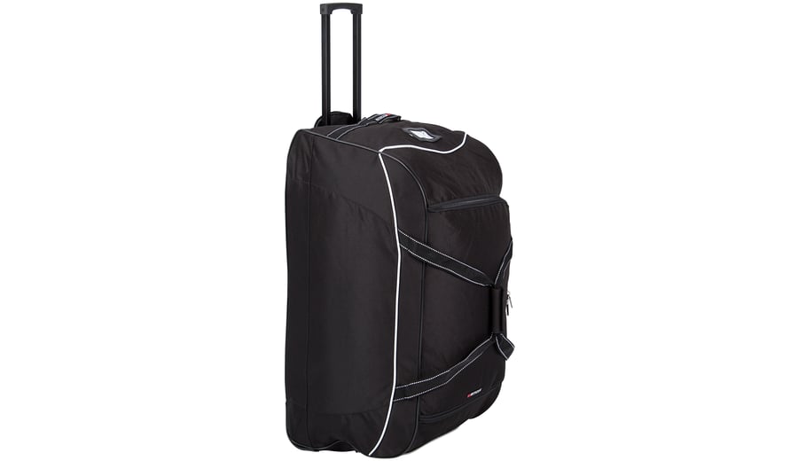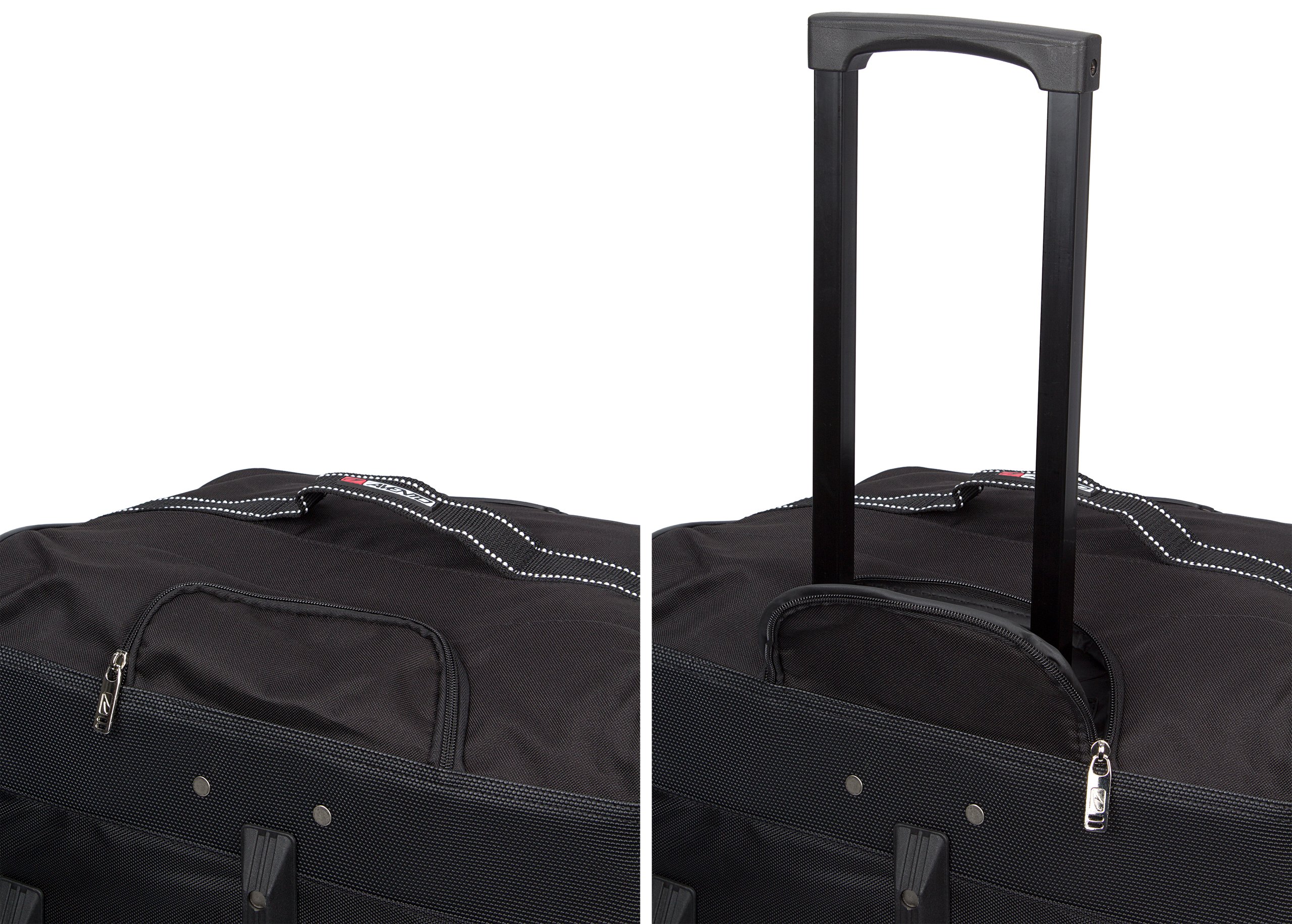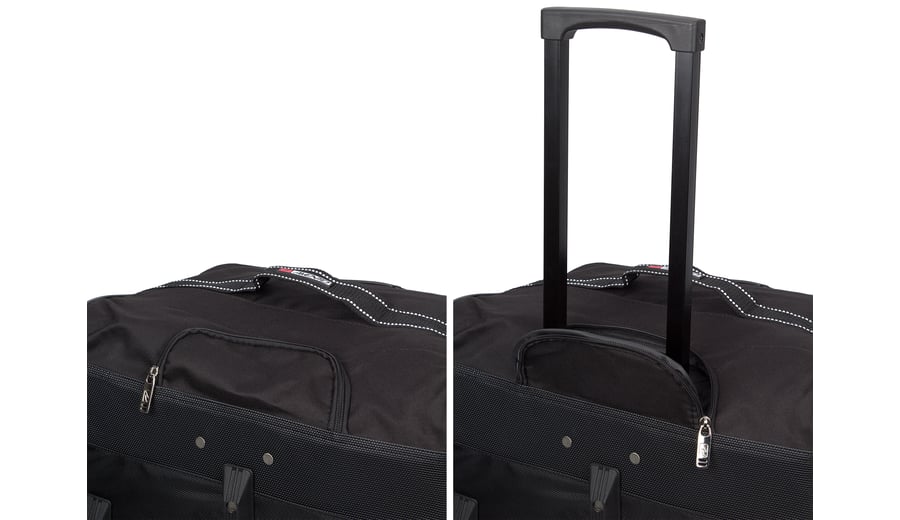 | Characteristics | • spacious top-loading main compartment with U-shaped zipper • 2 PP carrying handles combined with velcro fastener • strong PP handle on the side of the bag • telescopic trolley bar, can be covered with zipper • 2 trolley wheels • protective PVC material and 3 plastic protective strips on the bottom • plastic window with address card • dimensions approx. 80 x 40 x 40 cm |