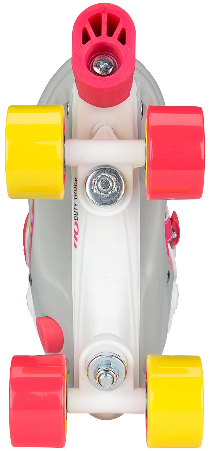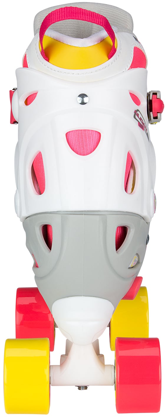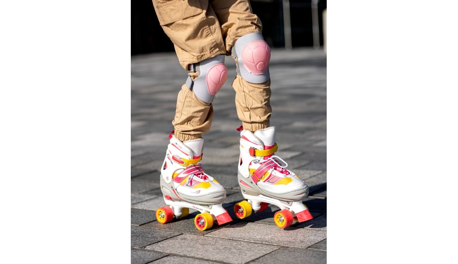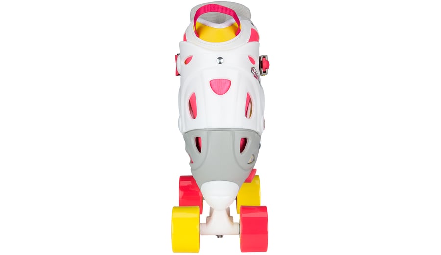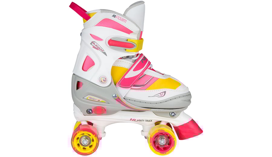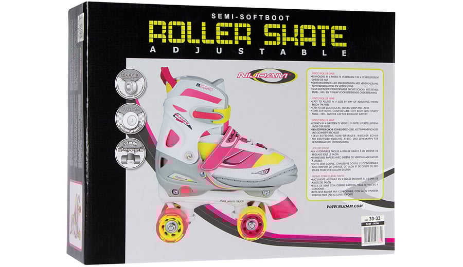 | Characteristics | • polyester mesh/PVC leather semisoft boot with lacing • adjustable in 4 sizes by pressing button at heel • dual quick-lock, instep strap with velcro tape • TPE ankle-, heel- and toe cap • PP chassis • 90A PVC wheels, dimension 52 x 32 mm • ABEC 3 ball bearings • 2x TPR stopper |