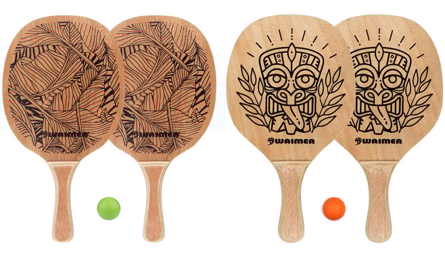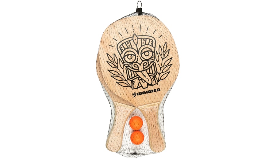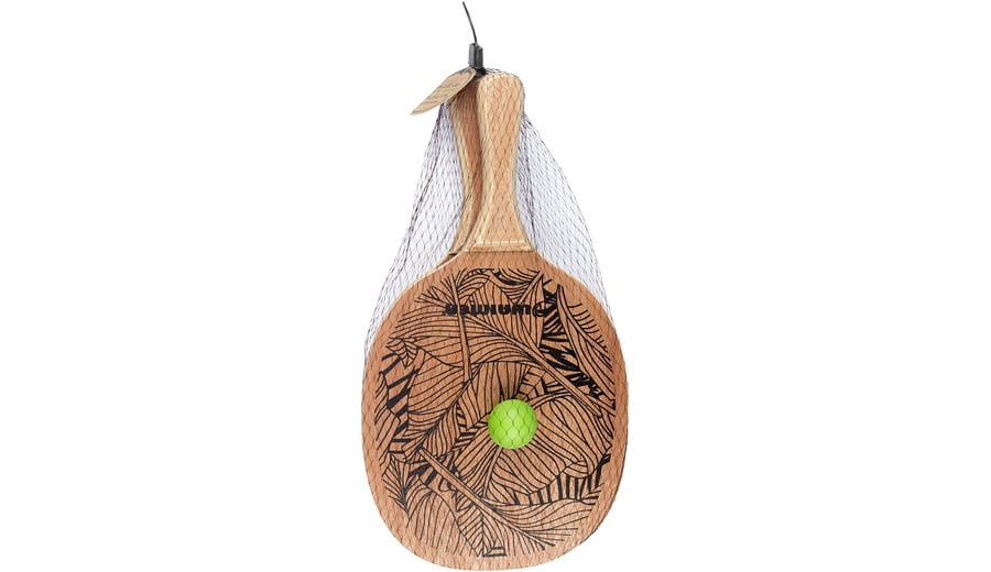 | Characteristics | • 5-layer wooden paddle, lacquered • wooden grip, thickness approx. 23 mm • PVC ball, diameter approx. 38 mm • dimensions paddle approx. 41.5 x 23.5 x 0.8 cm • weight paddle approx. 275 grams |