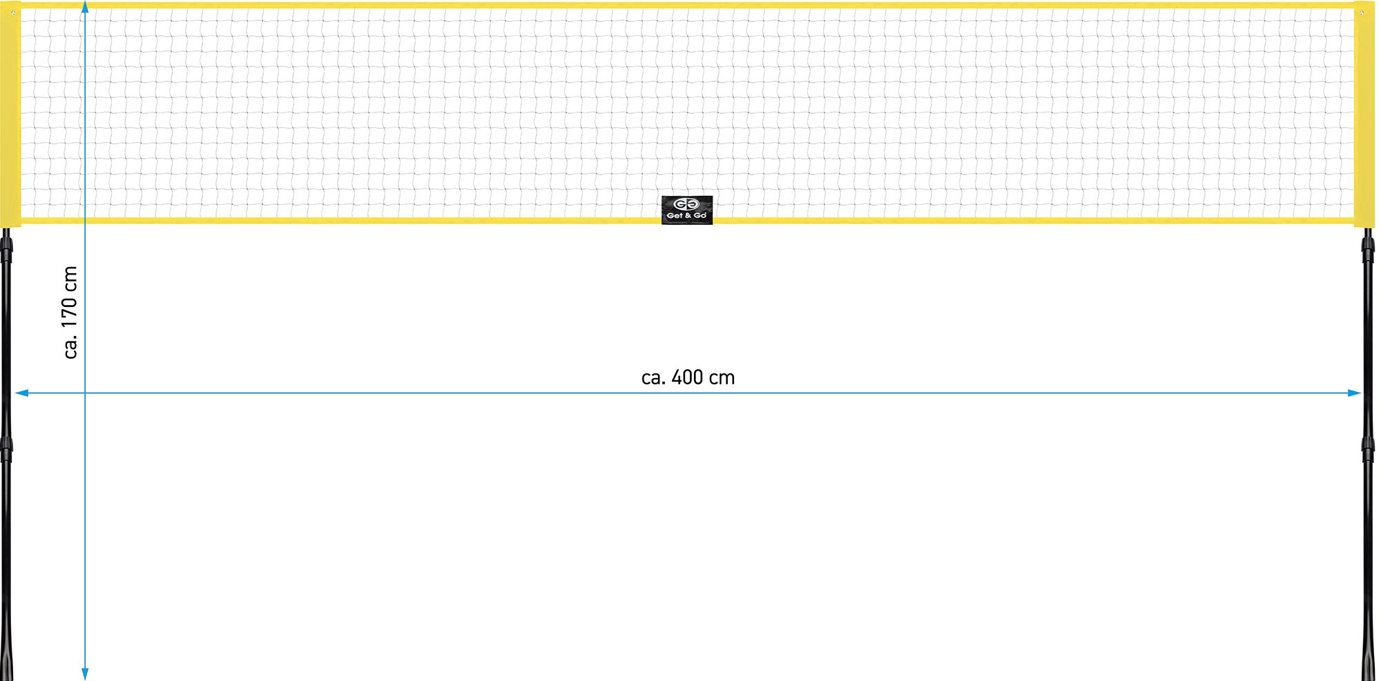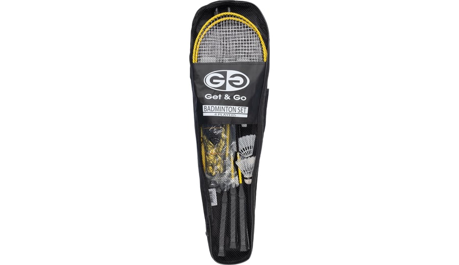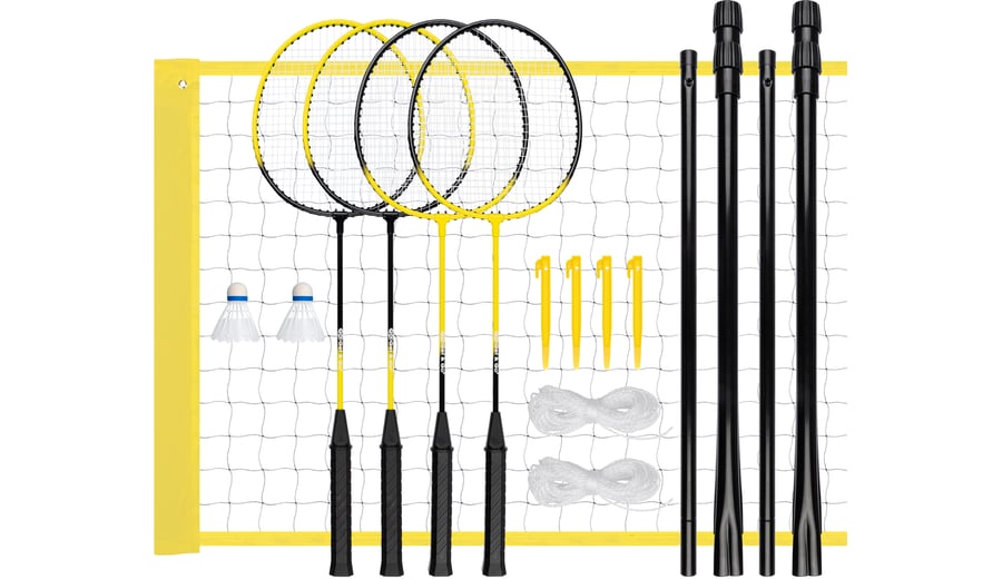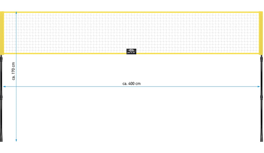 | Characteristics | • 2 sturdy aluminum poles (3-piece) ca. 170 cm • 1 nylon net (ca. 4 x 0.6 m) • 2 nylon shuttles • 4 steel badminton rackets • 4 plastic pegs • 2 nylon guy ropes • convenient nylon mesh carrying bag • dimensions of the net ca. 60 x 400 cm • adjustable net height maximum approx. 170 cm |