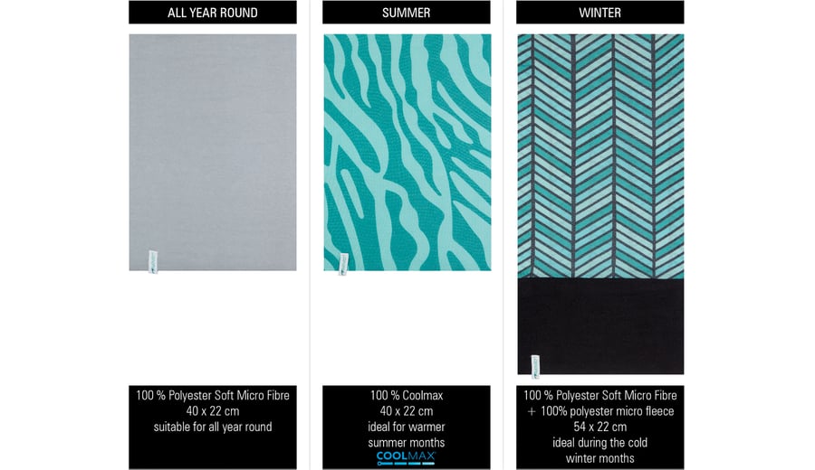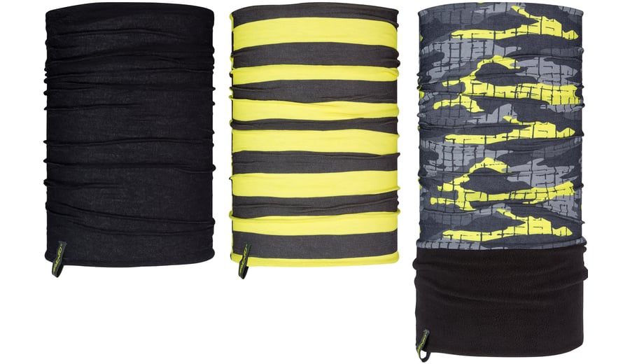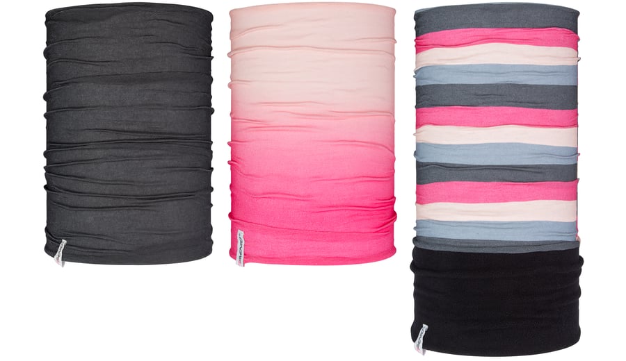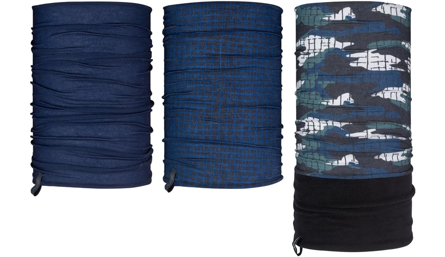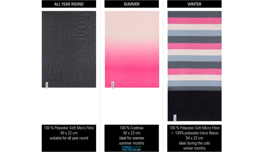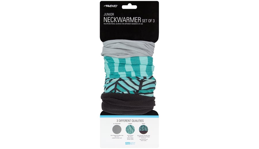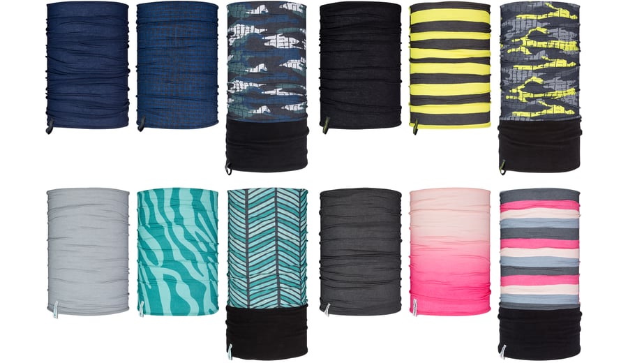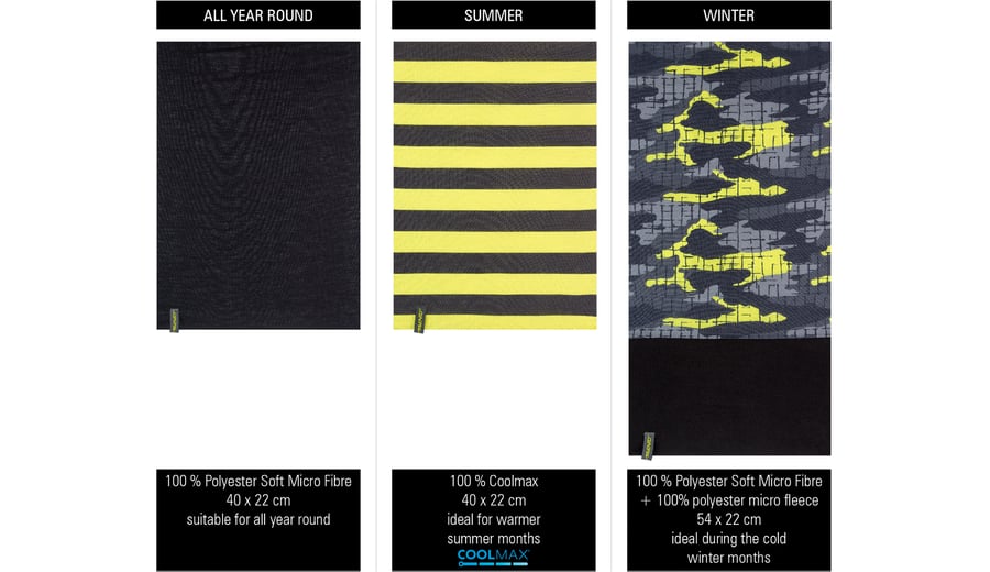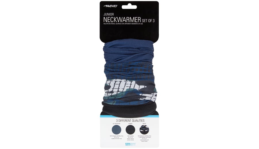 | Characteristics | • neckwarmer 1 made of 100% polyester, suitable for all year round • neckwarmer 2 made of 100% Coolmax®, ideal for warmer summer months • neckwarmer 3 made of polyester with an additional anti-pilling micro fleece part, ideal during the cold winter months • several ways to wear; scarf, bandana, hat etc. • dimensions neckwarmer 1 and 2 approx. 40 x 22 cm • dimensions neckwarmer 3 approx. 54 x 22 cm |