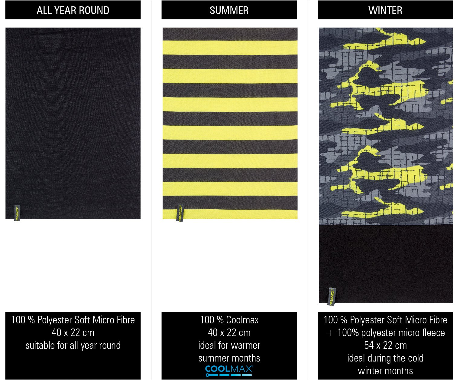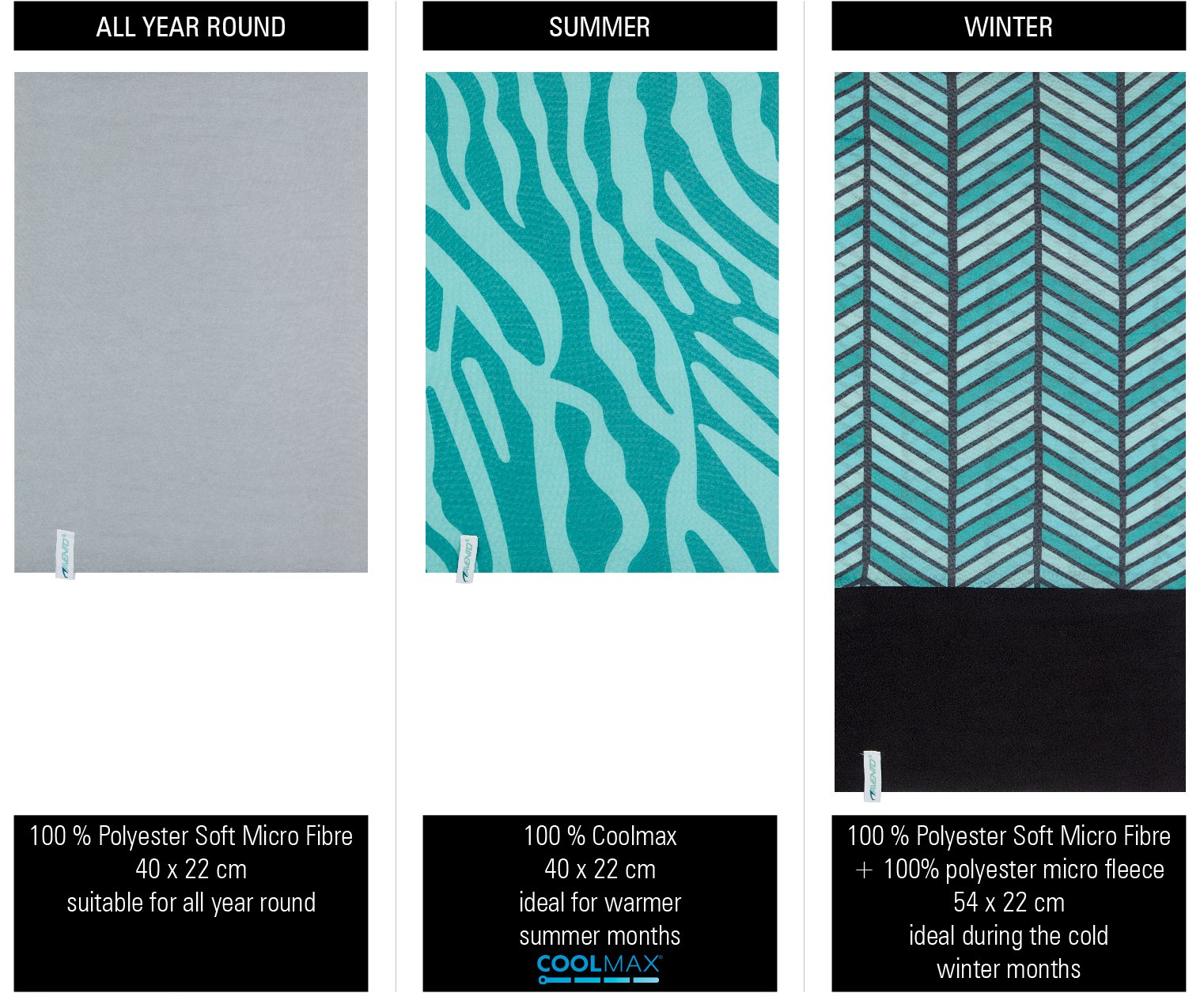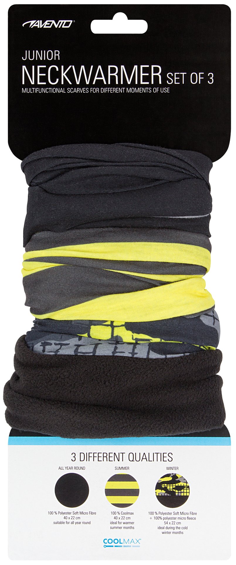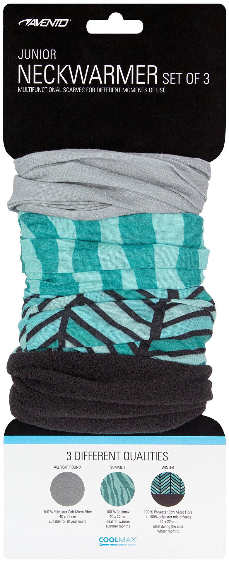 | Characteristics | • neckwarmer 1 made of 100% polyester, suitable for all year round • neckwarmer 2 made of 100% Coolmax®, ideal for warmer summer months • neckwarmer 3 made of polyester with an additional anti-pilling micro fleece part, ideal during the cold winter months • several ways to wear; scarf, bandana, hat etc. • dimensions neckwarmer 1 and 2 approx. 40 x 22 cm • dimensions neckwarmer 3 approx. 54 x 22 cm |