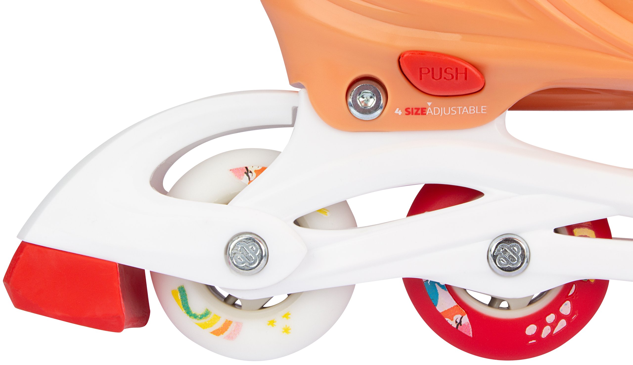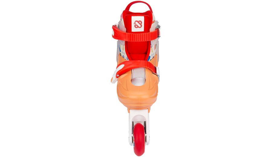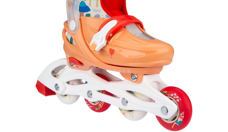 | Characteristics | • Size-adjustable to 4 sizes by means of push button mechanism • Quick-lock fastening • Outer shells: high-density shock-absorbing PE • Inner shoe: comfortable polyester, EVA, pearl foam and cotton-finish • Chassis: high-impact PP • Wheels: PU casted 85A, size 25-28: 64 x 22 mm, size 29-32: 70 x 22 mm • Bearings: sealed ABEC 5 carbon • Brake: TPR 85A • Tools: 2 Allen keys included |
