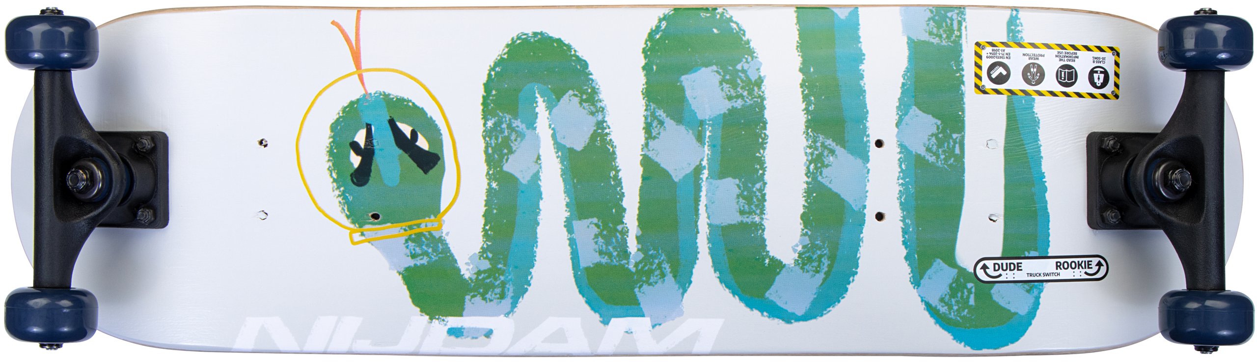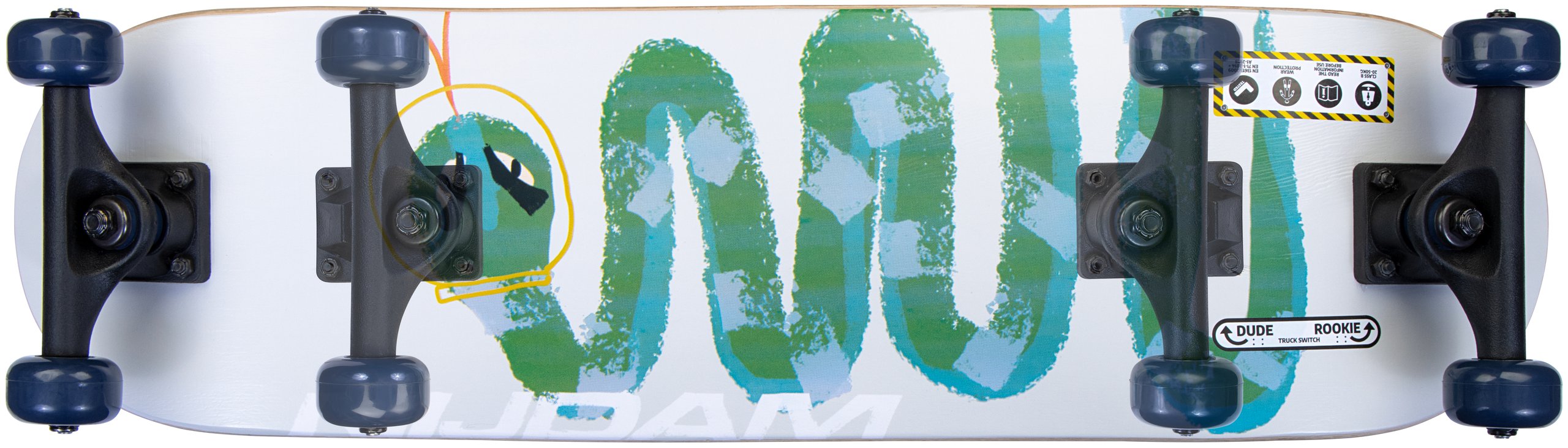 | Characteristics | • With pre-drilled holes for different placement of trucks for different skill levels • Board: 9-ply maple with print on underside, black 80AB griptape, 71 x 20 cm • Trucks: 5 inch synthetic heavy-duty trucks with PU bushing • Wheels: PU injection 92A, 50 x 30 mm • Bearings: sealed ABEC 5 carbon • Maximum load 50 kg (class B) |