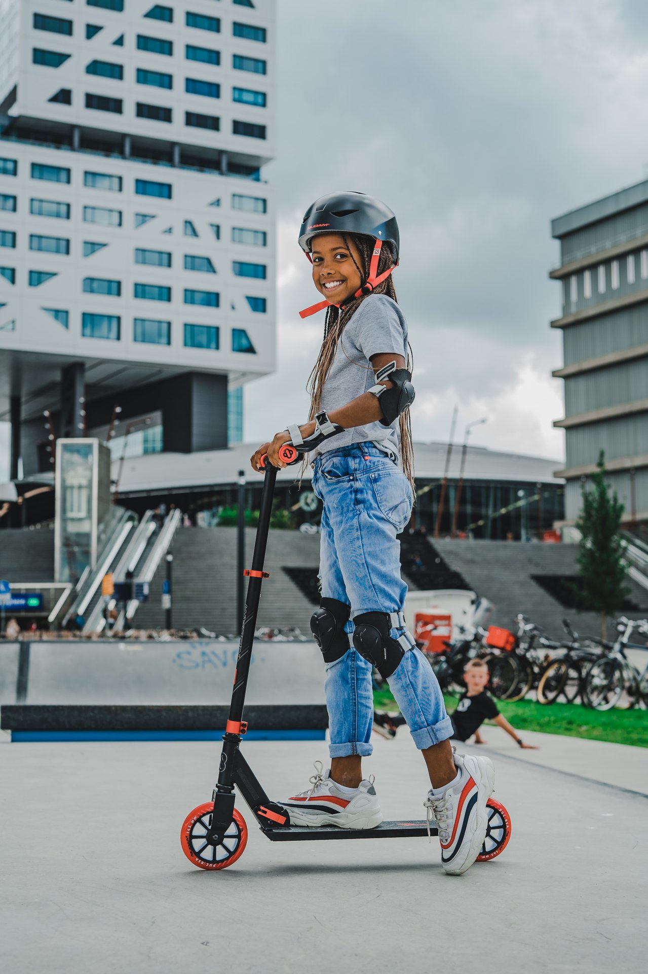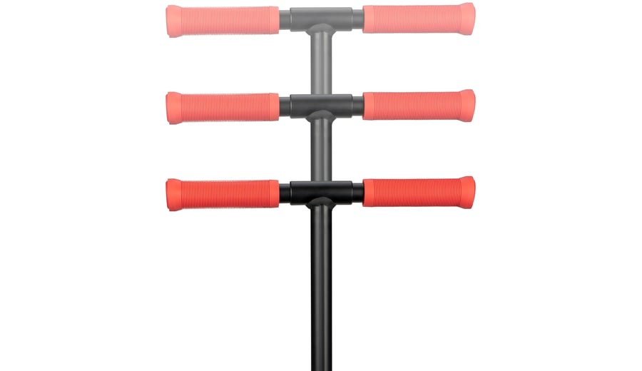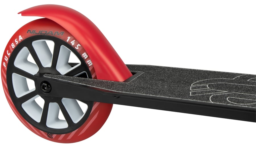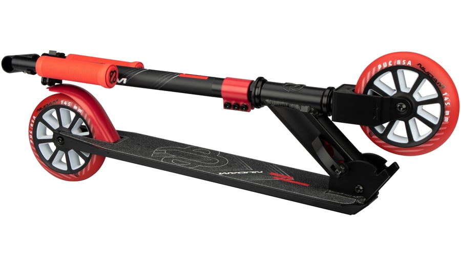 | Characteristics | • Collapsible with the 'fingertip-fold-up' mechanism • Handlebar/Frame: steel and lightweight aluminium, height-adjustable T-bar (78-89 cm) with rubber grips, width 34 cm • Deck: aluminium, 51 x 10.5 cm • Wheels: PU casted, 145 x 24 mm • Bearings: sealed ABEC 7 • Brake: rear wheel sprung paddle steel brake • Tools: 2 Allen keys included |