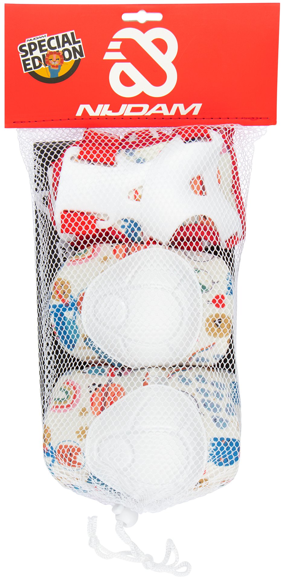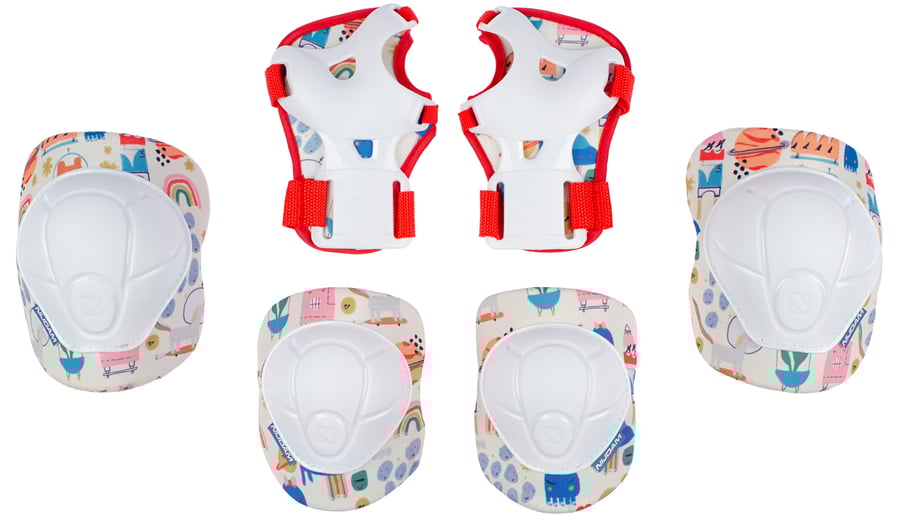 | Characteristics | • Main pads: comfortable, sturdy EVA foam with cotton-finish cover • Protective caps: high-impact shock-absorbing PE • Each element is adjustable thanks to the elastic straps and Velcro closures • Set includes 1 pair of elbow-, wrist- and knee protectors • Set meets current safety standards |
