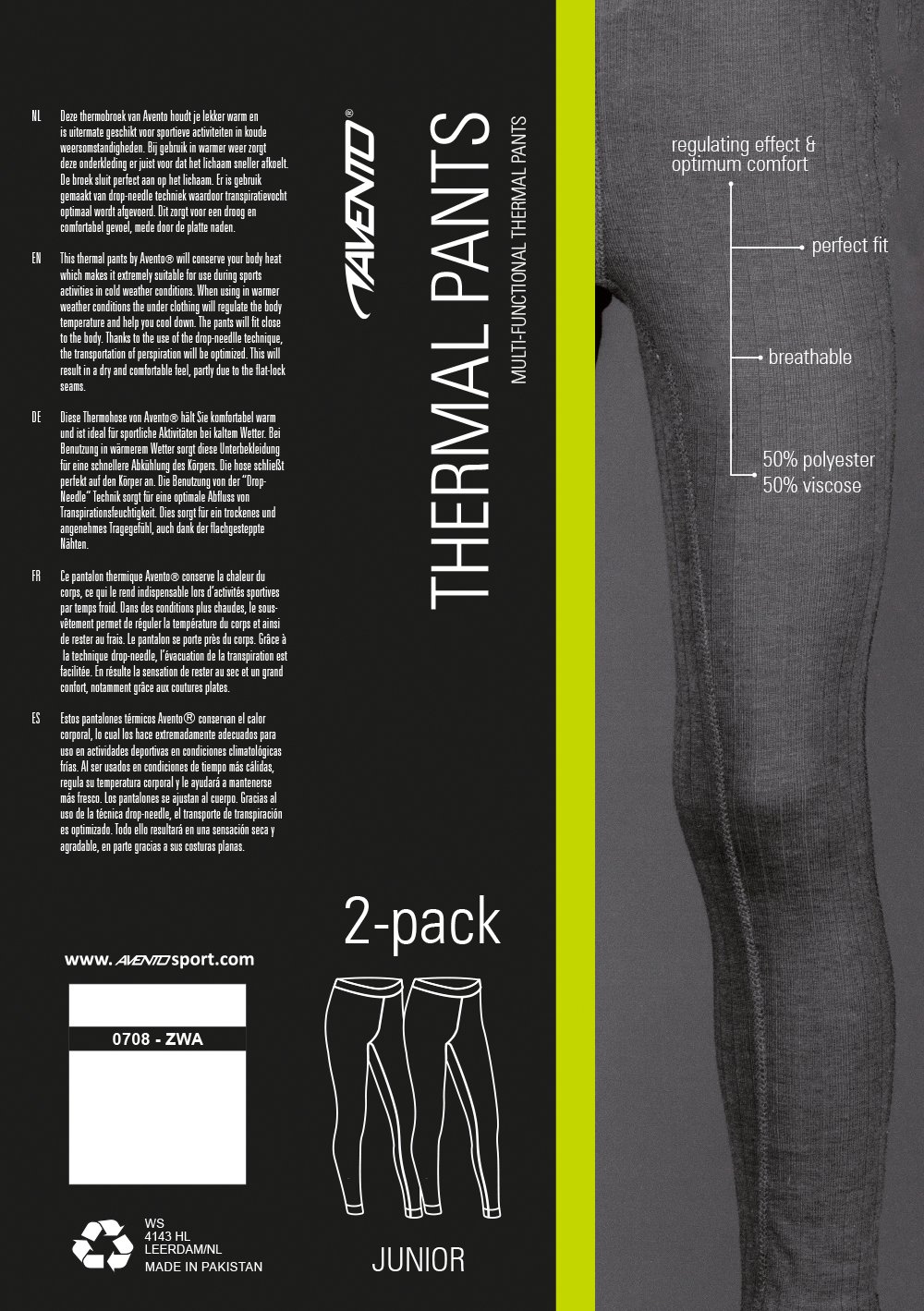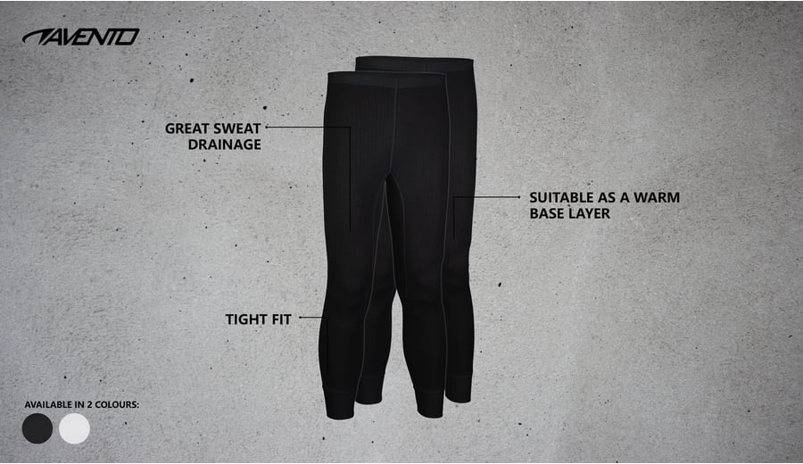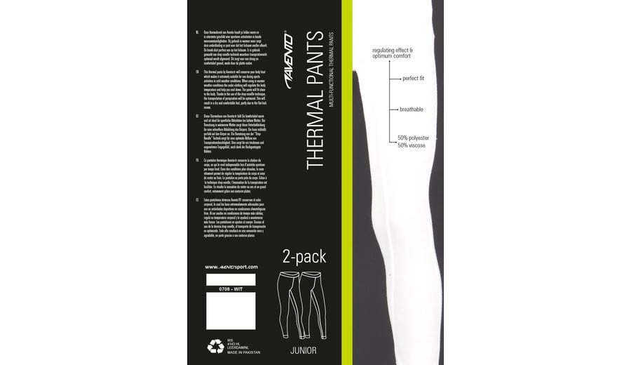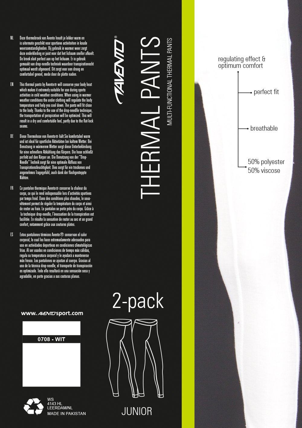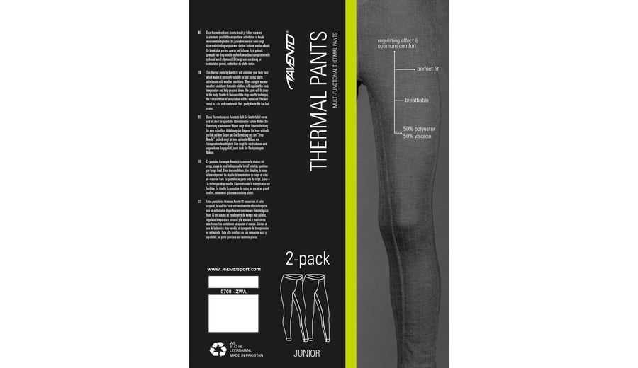| Kenmerken | • stof met drop-needle techniek "banen" die ervoor zorgen dat transpiratievocht snel afgevoerd wordt en het lichaam droog en warm blijft • thermo onderkleding • elastiek in de taille • elastisch boord aan de onderzijde van de broekspijp • platte naden • gewicht ca. 240 - 250 gr/m² |