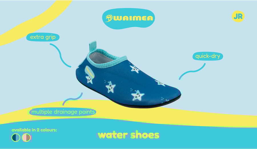 | Kenmerken | • comfortabele, vrolijke waterschoenen van dubbele mesh • uitstekende grip met antislip zool • TPR zool met waterdoorlatende punten • uitneembare binnenzool van EVA foam met links/rechts aanduiding • aantreklus aan de achterzijde |