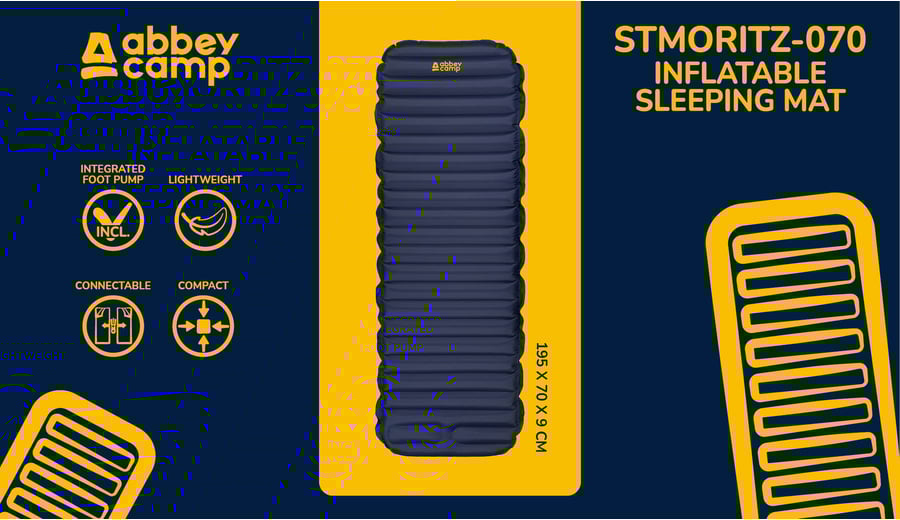 | Kenmerken | • hoogwaardige polyester pongee buitenzijde • gevulkaniseerde naden • met handige geïntegreerde foam voetpomp • stevig extra ventiel • beide zijkanten zijn voorzien van drukknopen om twee matjes aan elkaar vast te maken • afmeting ca. 195 x 70 x 9 cm • zeer compacte pakmaat van ca. 43 x ø16 cm • gewicht ca. 1.8 kg • PFC en PFAS vrij • per stuk opgerold met twee elastische banden • geleverd in een handige polyester draagtas |