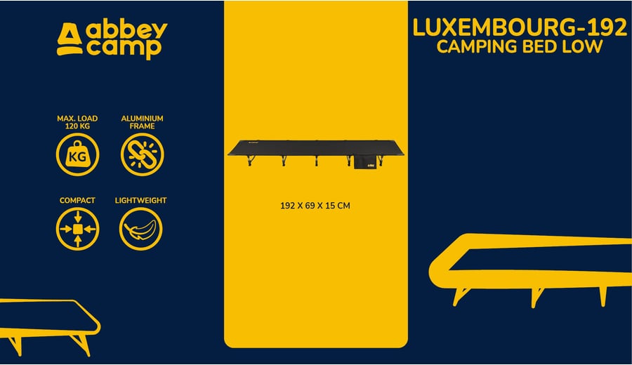 | Kenmerken | • compact, lichtgewicht veldbed • 600D polyester doek met PU coating • 5 stevige, gepolijst aluminium poten • met handig opbergvak aan de zijkant voor waardevolle spullen • afmeting ca. 192 x 69 x 15 cm • geleverd in handige polyester draagtas • afmeting draagtas ca. 40 x 15 x 15 cm • totaal gewicht ca. 2,1 kg • maximale belasting 120 kg |