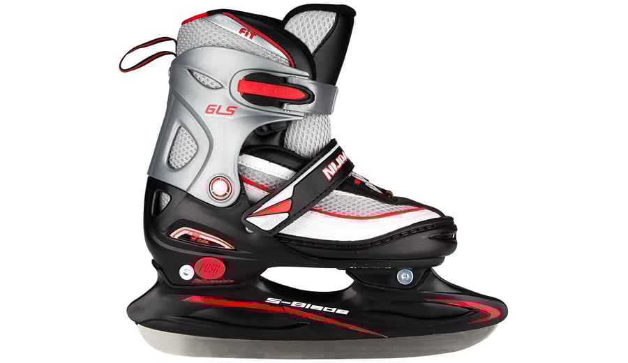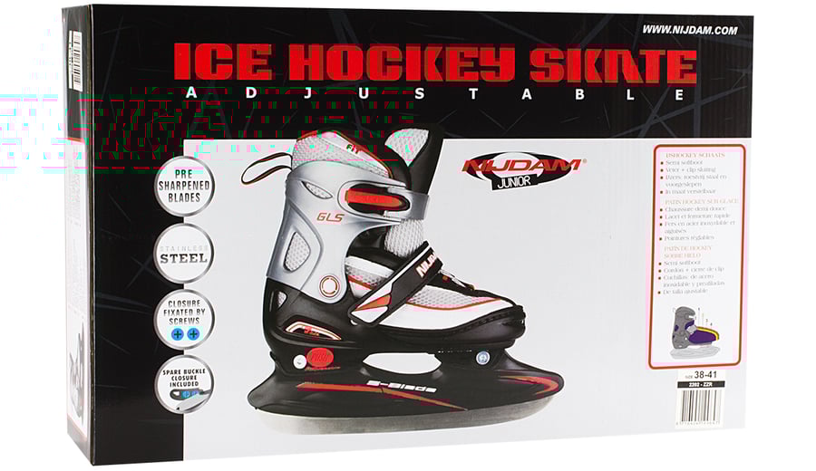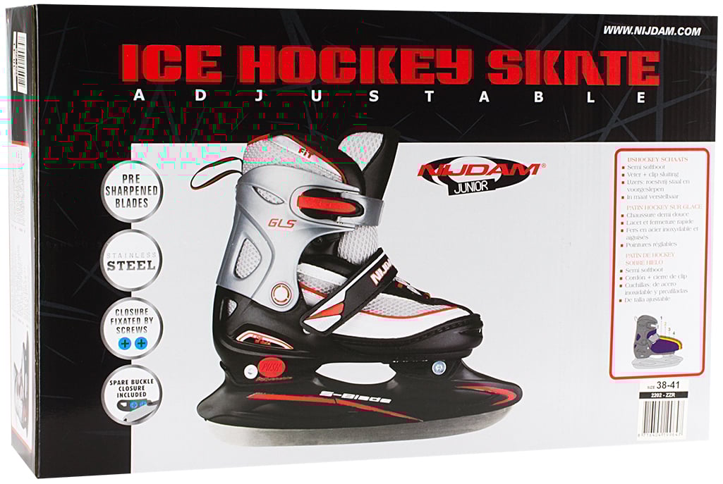 | Kenmerken | • polyester mesh/PVC lederen semi-softboot • verstelbaar in 4 maten d.m.v. drukknop aan hiel • 2-delige snelsluiting met slot • maat 30/33 met 2x klittenbandsluiting, maat 34/37 en 38/41 met vetersluiting en wreefband met klittenband • TPE enkel-, hiel- en teenkap • synthetische schaatshouder met roestvrijstalen ijshockeyschaatsijzers • schaatsijzers zijn reeds voorgeslepen |