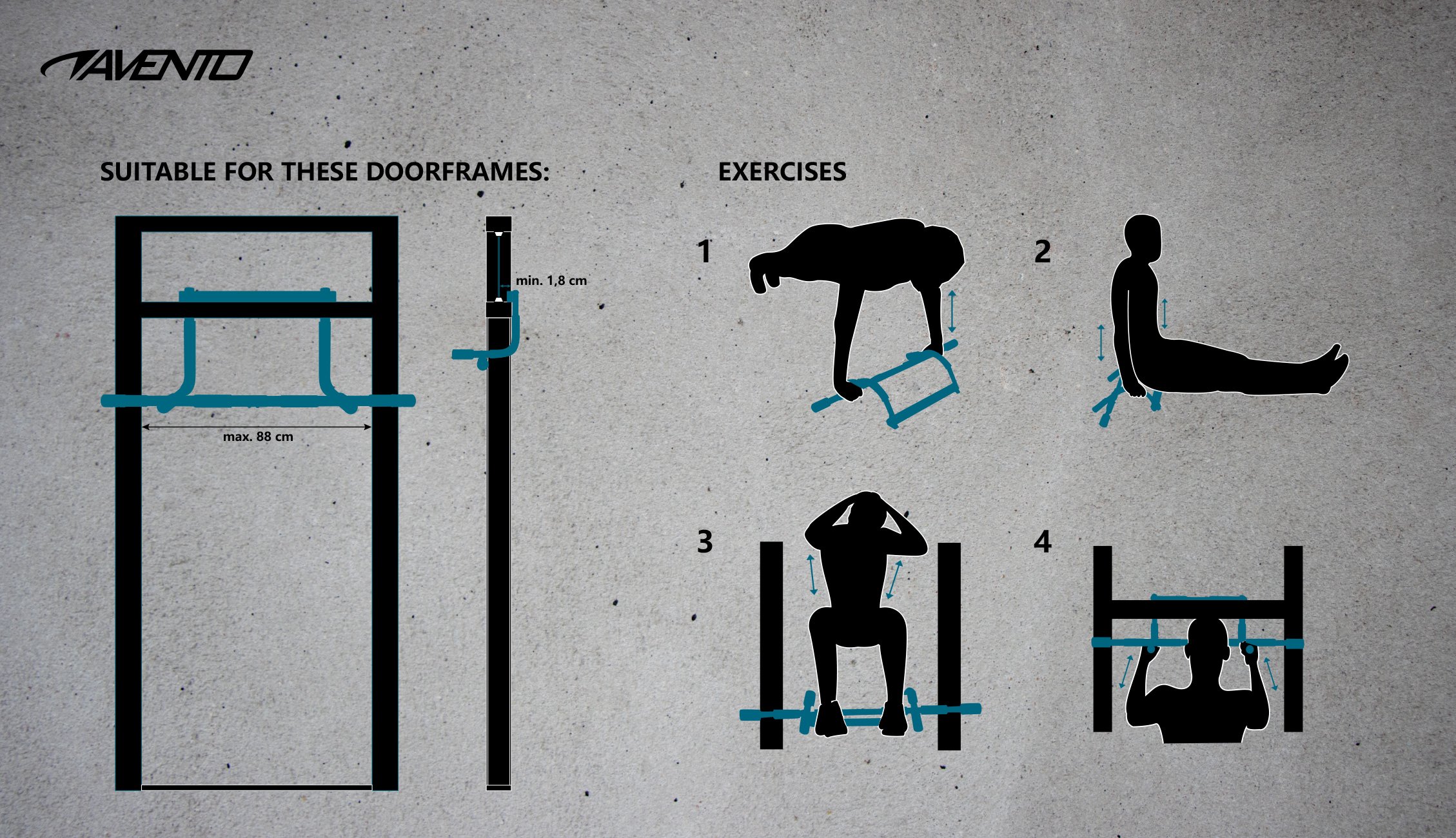 | Kenmerken | • frame gemaakt van staal met geborstelde poedercoating • handgrepen met foam bekleed • kunststof verbindingsstuk • geschikt voor een gebruiker met een lichaamsgewicht tot 100 kg • geschikt voor deurkozijnen met deuren van 60-88 cm |