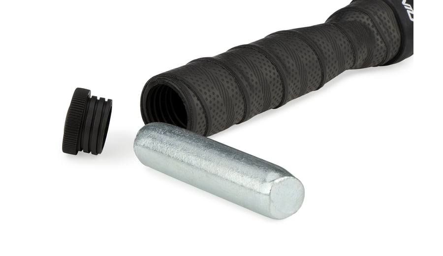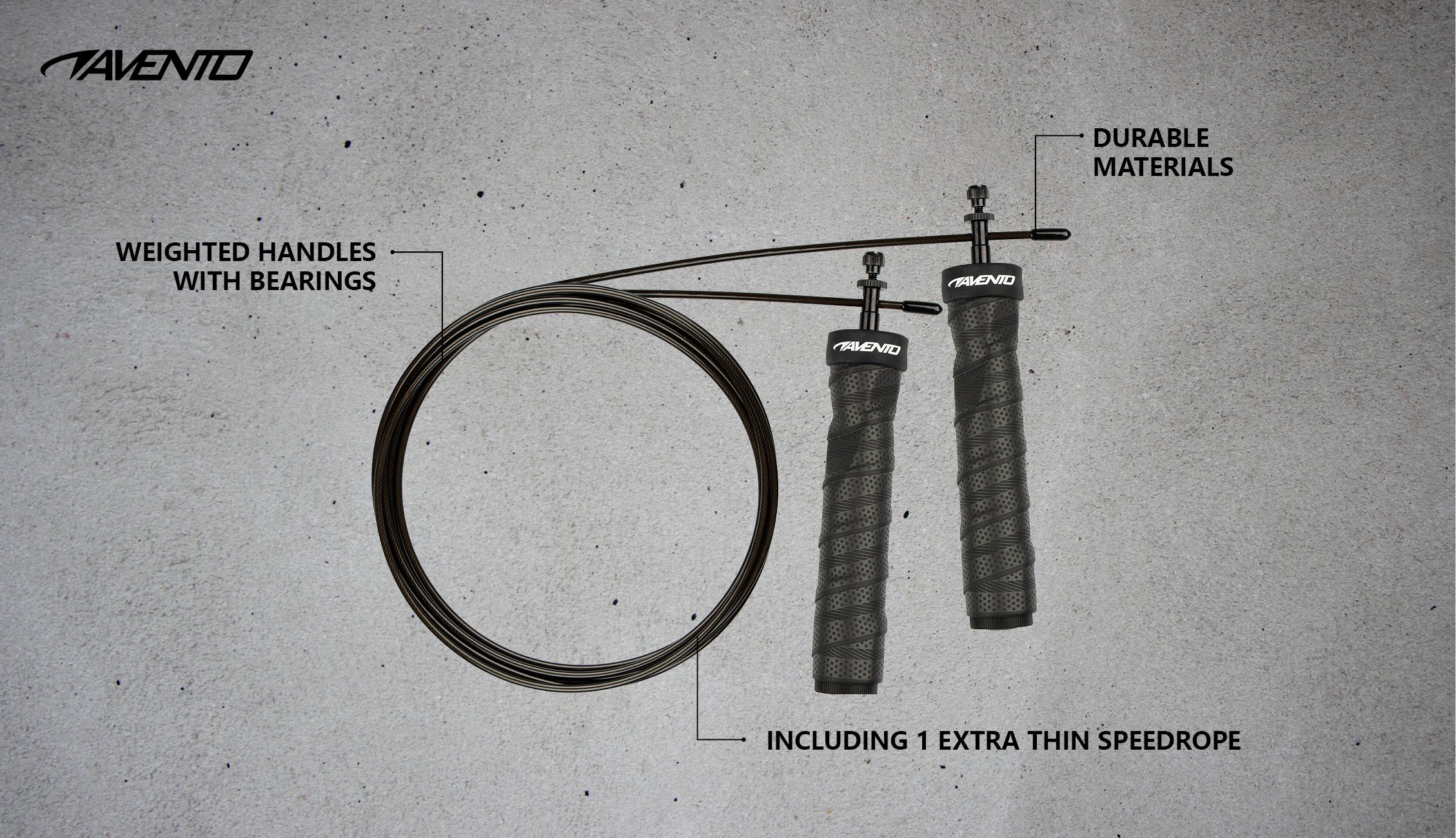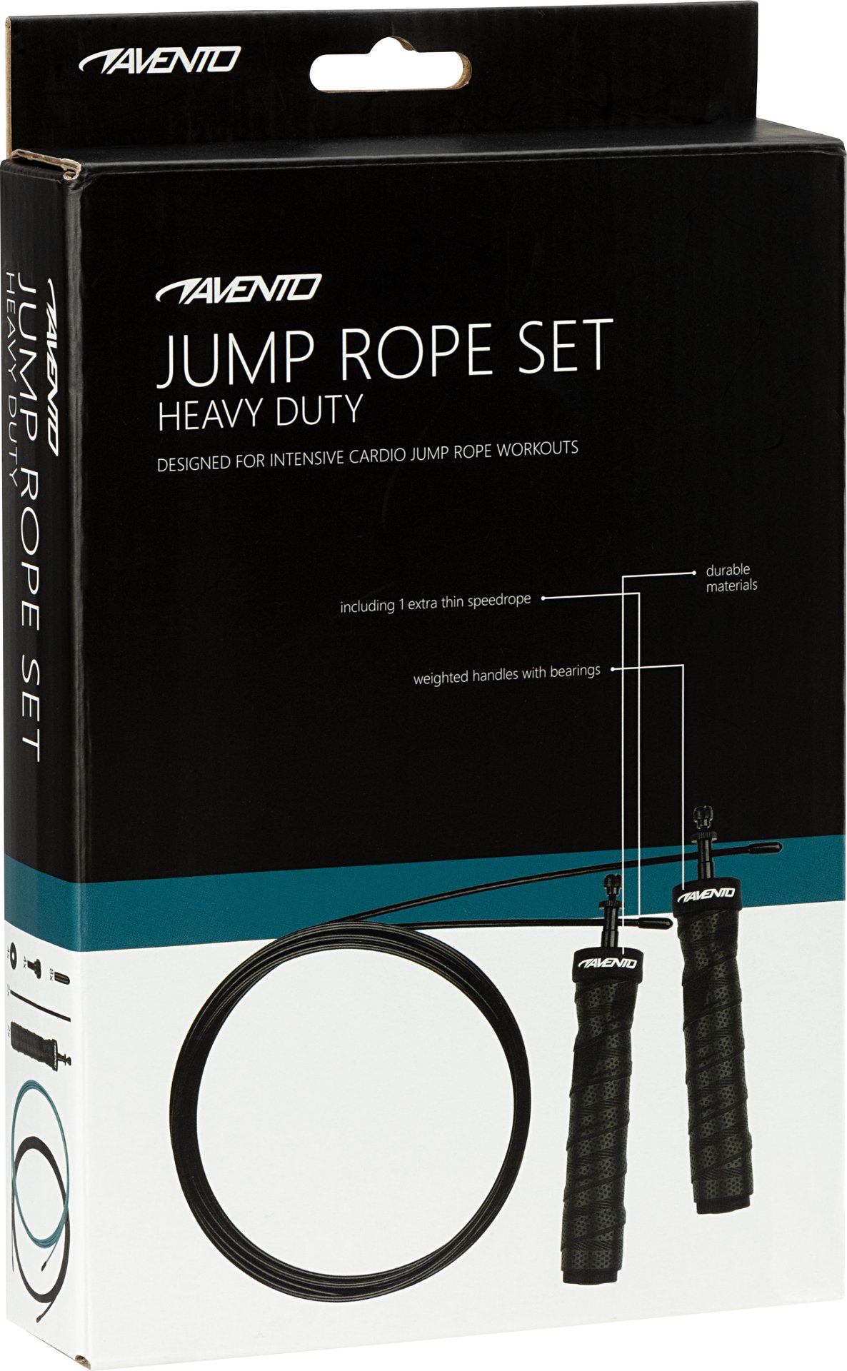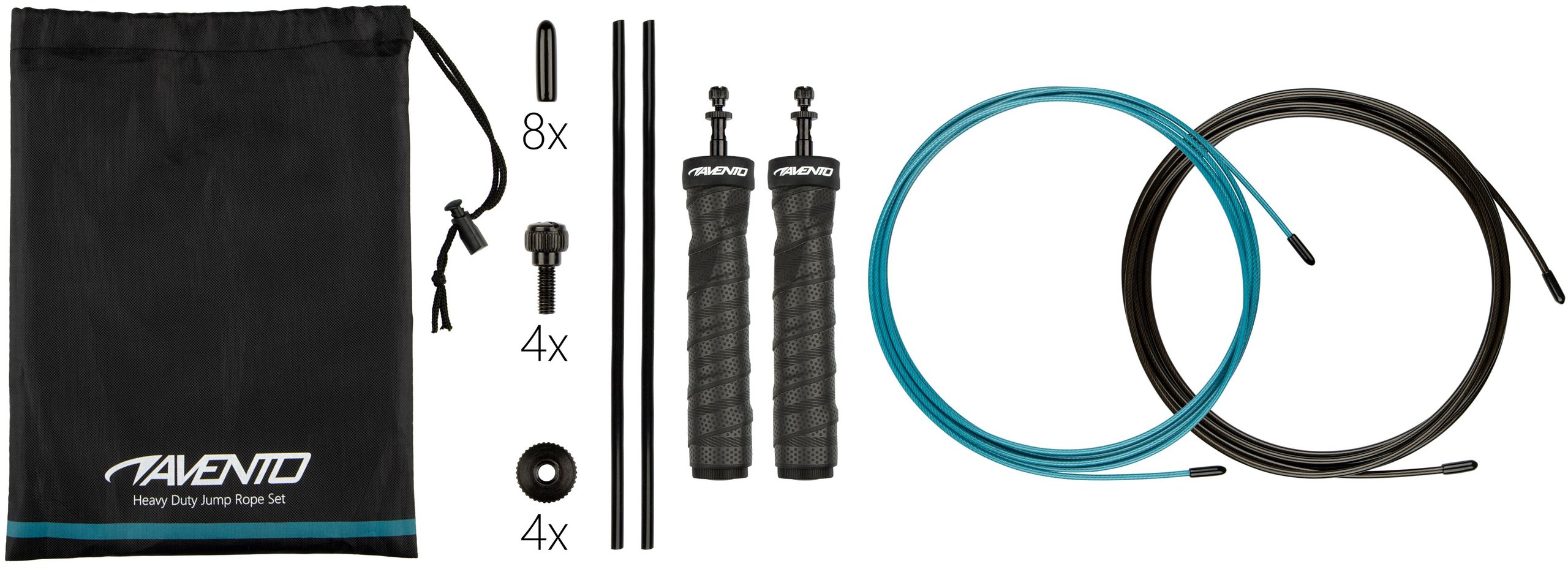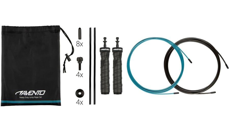 | Kenmerken | • 1 verwisselbaar koord met kunststof beschermingsomhulsel • in gewicht verstelbare handvatten • 1 extra, lichtgewicht koord met kunststof beschermingsomhulsel • verzwaarde PP handgrepen met PU antislip tape en kogellagers • lengte koord ca. 300 cm, d.m.v. schroefje gemakkelijk aan te passen • dikte koord: zwart ca. 3.3 mm, blauw ca. 2.6 mm • lengte handgreep ca. 14 cm • gewicht complete set ca. 530 gram • inclusief: handig draagtasje, reserve bevestigingsschroefjes en afsluitdopjes |