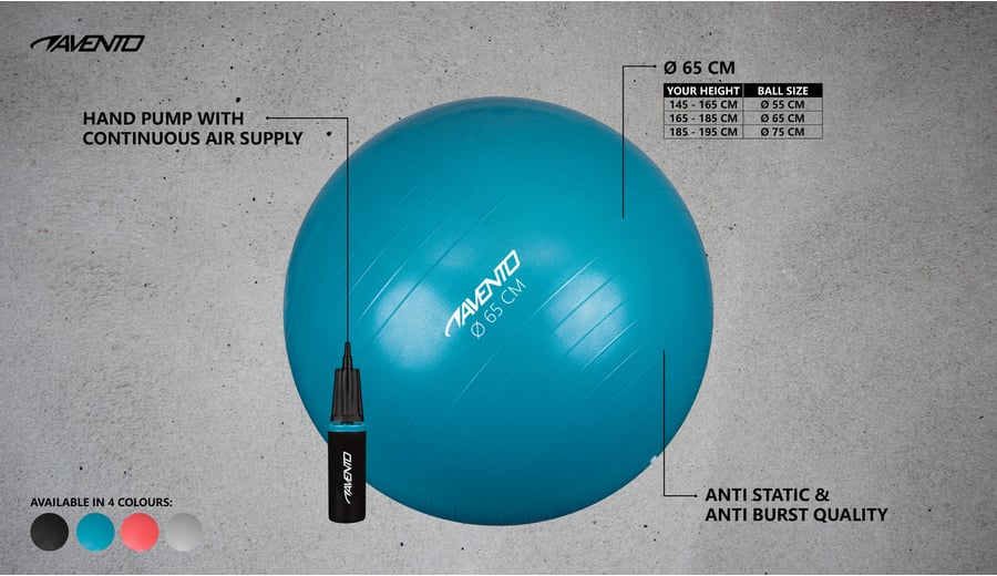 | Kenmerken | • anti-burst • anti-statisch • diameter bal ca. 65 cm • geschikt voor gebruiker met een lichaamslengte van ca. 165 tot 185 cm en een lichaamsgewicht tot 100 kg • gemaakt van huidvriendelijke materiaal • gewicht bal ca. 1.100 gram • inclusief PE handpomp • afmeting pomp 25/34 x 5 cm |