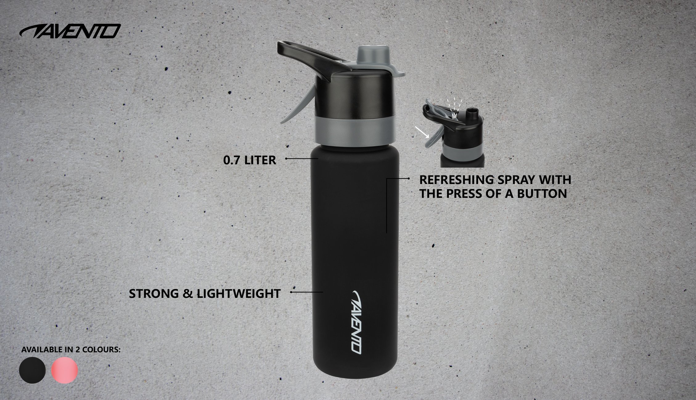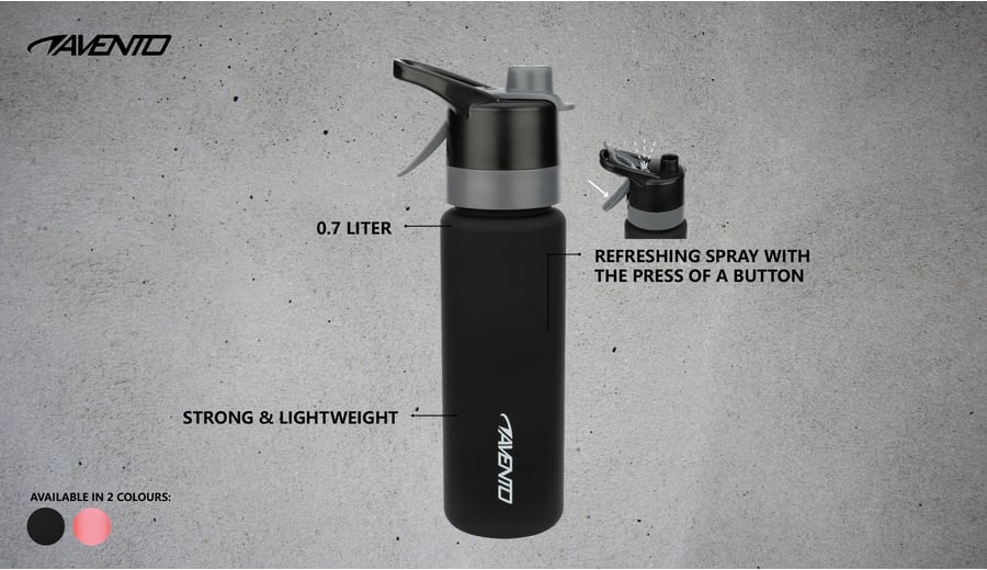 | Kenmerken | • Tritan kunststof fles • kunststof dop • sprayfunctie voor verkoeling • lichtgewicht • hoogte ca. 27 cm • inhoud 0.7 liter |
