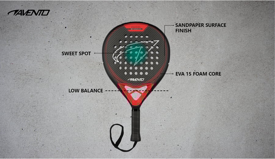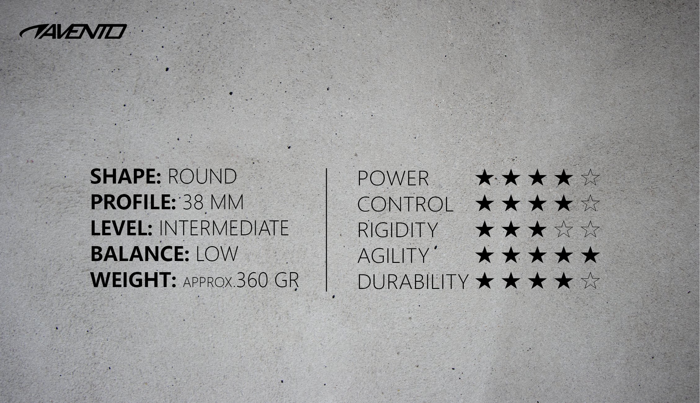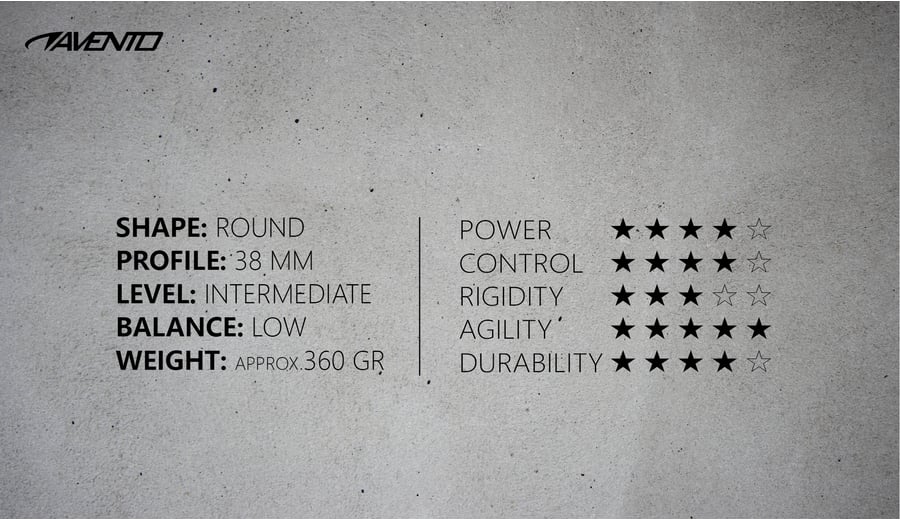 | Kenmerken | • ronde vorm • 3K Carbon racketframe • eva 15 foam kern • racketoppervlak met matte, geschuurde sandpaper finish • balans 250-260 mm (lage balans) • framedruk 260kg • getapete grip • met standaard polsband • lengte 455 mm, breedte 270 mm dikte 38 mm, • gewicht 360+/- 10g |