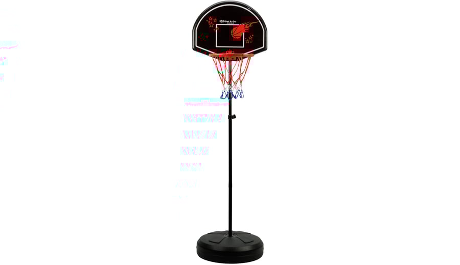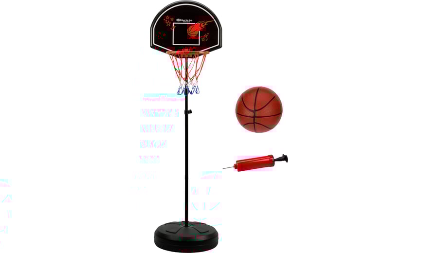 | Kenmerken | • complete junior basketbalstandaard set met bal en pomp voor kinderen • ringhoogte verstelbaar vanaf ca. 153 cm tot ca. 172 cm • 12 mm metalen ring met coating, diameter ca. 27 cm • met bijpassende basketbal en pomp • PE voet kan gevuld worden met zand of water voor stabiliteit, afmeting ca. ø44 x13 cm • PP bord, afmeting ca. 48 x 38 cm • voor binnen- en buitengebruik |