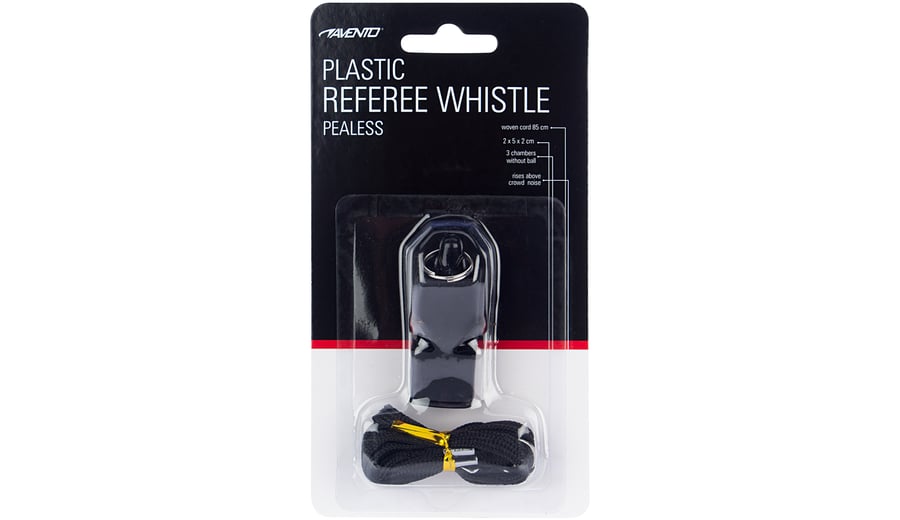 | Kenmerken | • kunststof fluit • polypropyleen koord, lengte 85 cm • officiële scheidsrechterfluit zonder bal • d.m.v. speciale 3-kamer structuur ook in regenachtig weer goed hoorbaar • eenvoudig te reinigen • afmeting 2.0 x 5.0 x 2.0 cm |